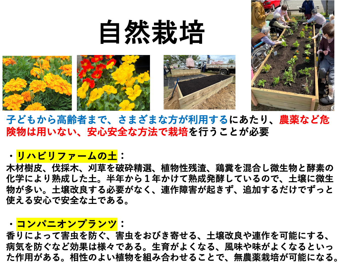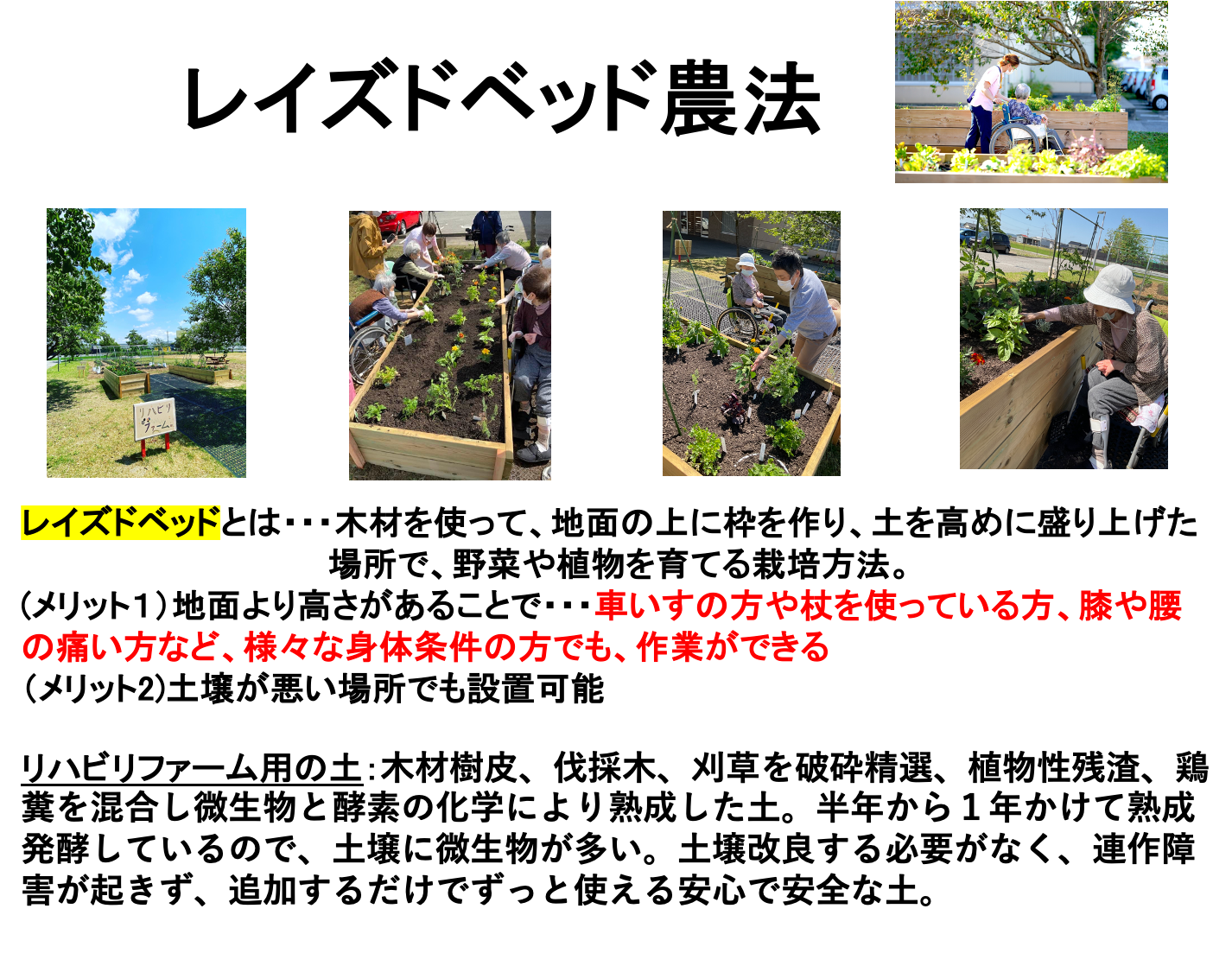 畑に向かない土壌でも、場所でも設置可能で、地面より高さがあるので、車いすの方や杖を使っている方、膝や腰の痛い方など、様々な身体条件の方でも、作業が出来ます。