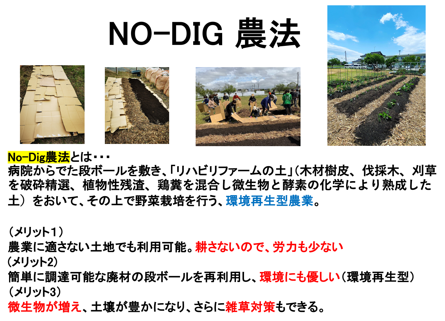 また、海外で行われ始めているノ―ディグを体験しました。畑にダンボールを敷き、野菜を植えるための畝のスペースを作って、その上に、植物性有機堆肥をのせ、畝間の通路スペースにはウッドチップでマルチングしました。