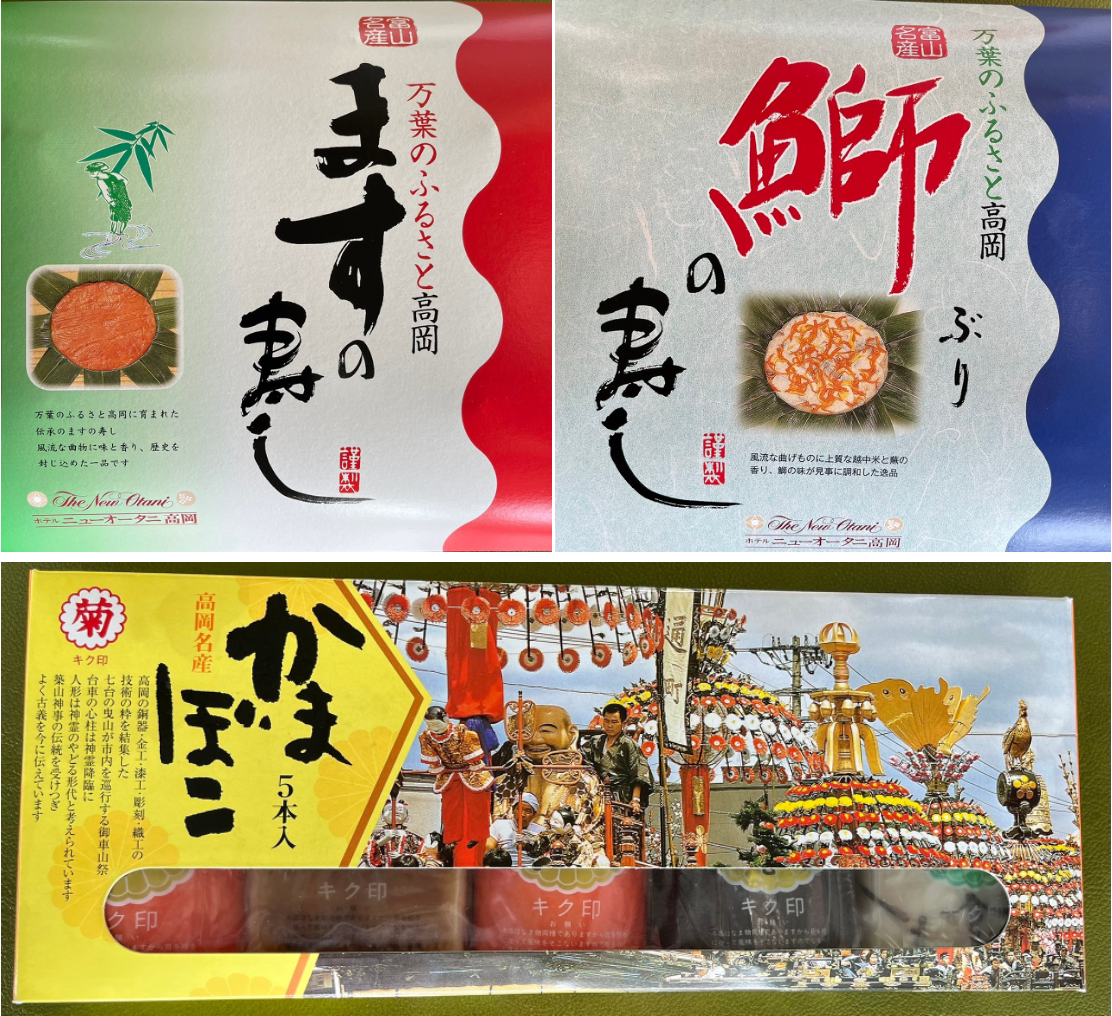 製造者:ニューオータニ高岡フード株式会社(鱒の寿し・ぶりの寿し)、有限会社 広又蒲鉾商店(蒲鉾)