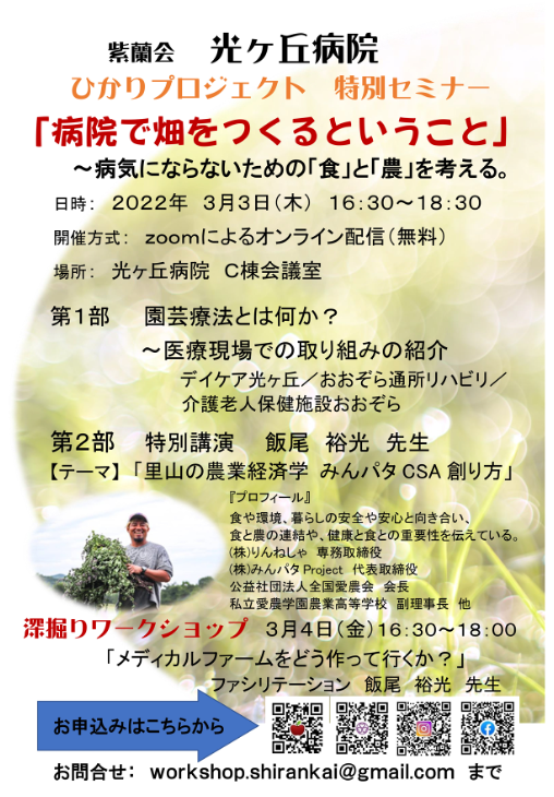 2022年3月3・4日、医療法人社団紫蘭会光ヶ丘病院のひかりプロジェクト特別セミナー「病院で畑をつくるということ ~病気にならないための「食」と「農」を考える」が行われました。また、zoomを使って、オンラインの配信も行いました。ゲストスピーチは、飯尾 裕光 さん(Hiroさん)。お話を聞いて、有機農業には多面的機能と付加価値がたくさんあることに改めて気づかされました。