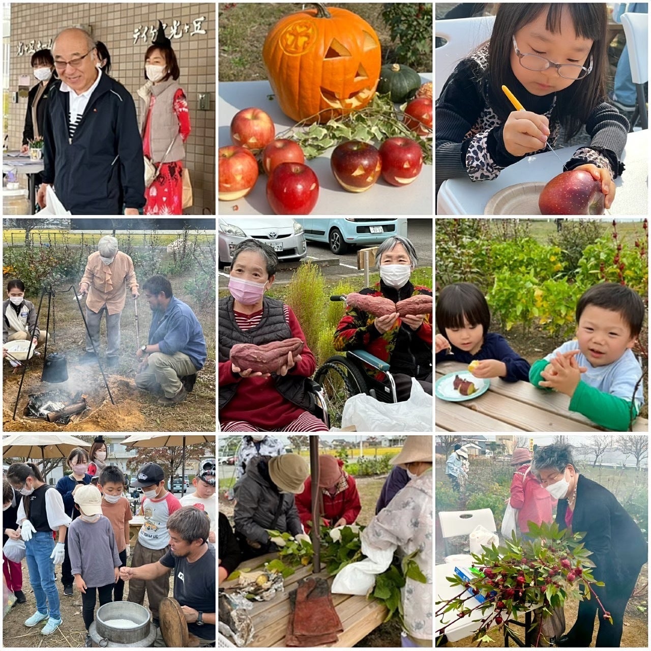 畑の中の焚火は、とても好評で、懐かしいと見つめる高齢者とリアルな焚火を体験出来て楽しむ子供たちと、とても盛り上がりました。また、リンゴを使ってカービングも体験し、ジャック・オー・ランタンの制作を体験しました。