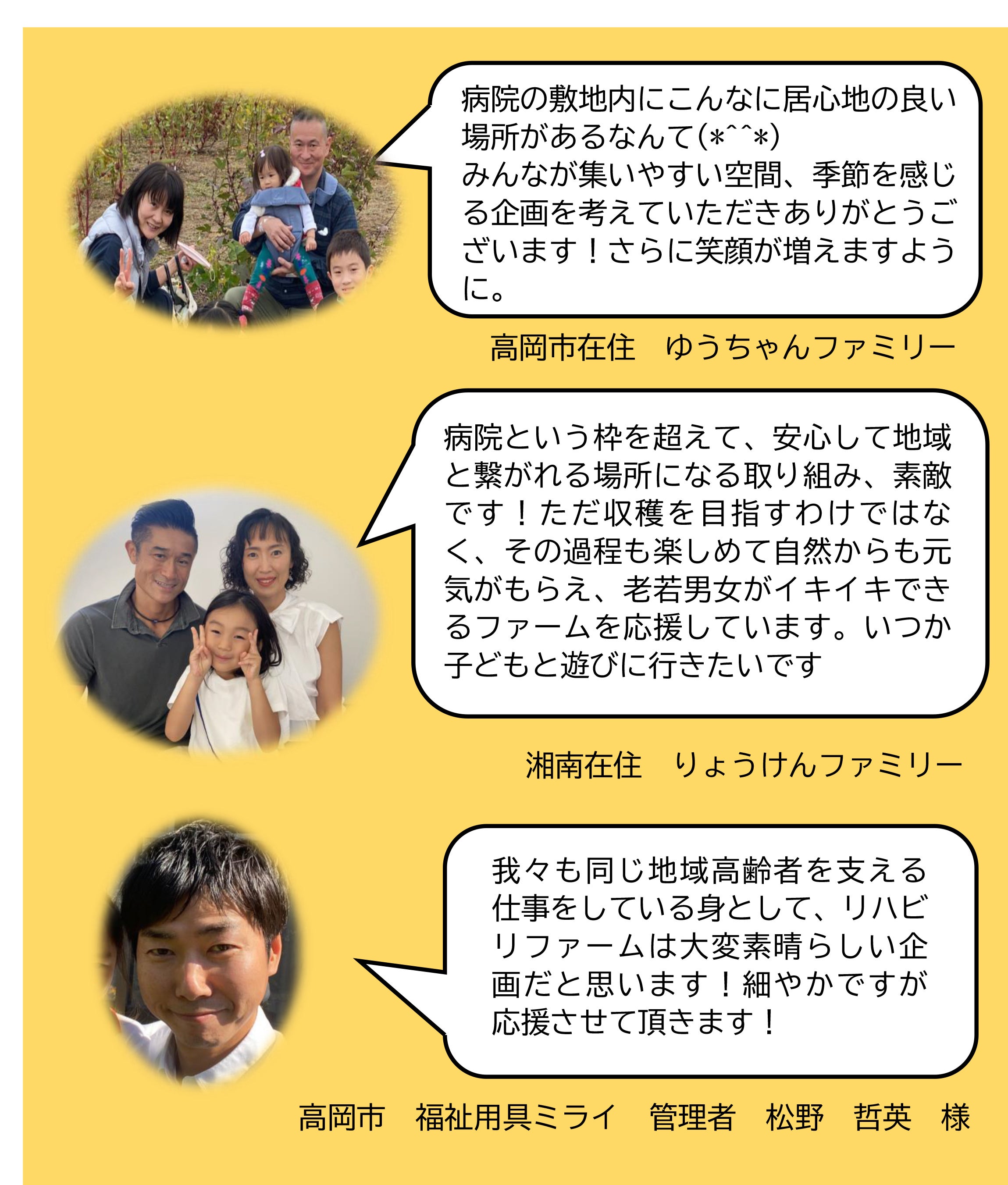 いただいたご支援をしっかりと形にして、さらに、リハビリファームの更なる拡張・充実を目指し、病院発・地域に開いたみんなの畑として、農を通じて、子供から高齢者まで楽しめる居心地の良い場所を目指していきたいと思います。