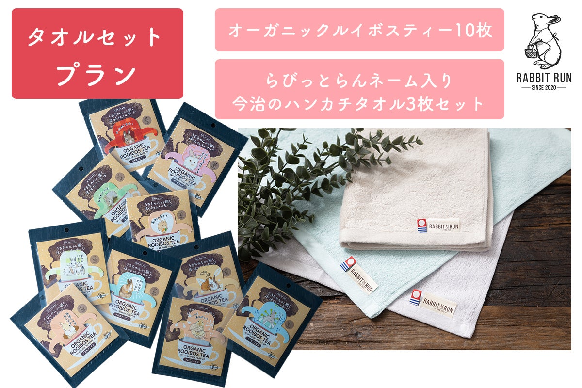 返礼品としてORGANIC ROOIBOS TEA(オーガニックルイボスティー)レモンフレーバー〜ノンカフェイン〜を10枚セットとらびっとらんのネームタグ入り今治タオルのハンドタオル3枚セット(ベージュ・パープル・ブルー各1色)をお届けします。世界にその名を広げる愛媛県今治市の今治タオル。独自の厳しい品質基準を満たしたタオルだけがブランドタグをつけることができます。シンプルな単一の優しいカラーで、らびっとらんのネームタグがついています。ハンドタオルのサイズは34×35cmとハンカチよりも少し大きいサイズ。タオルのために開発された専用糸「ほたか」で織り上げた柔らかい肌触りのハンドタオルです。高品質なオーストラリア綿100%使用しています。柔らかい触り心地がホッとする1枚に仕上がっております。