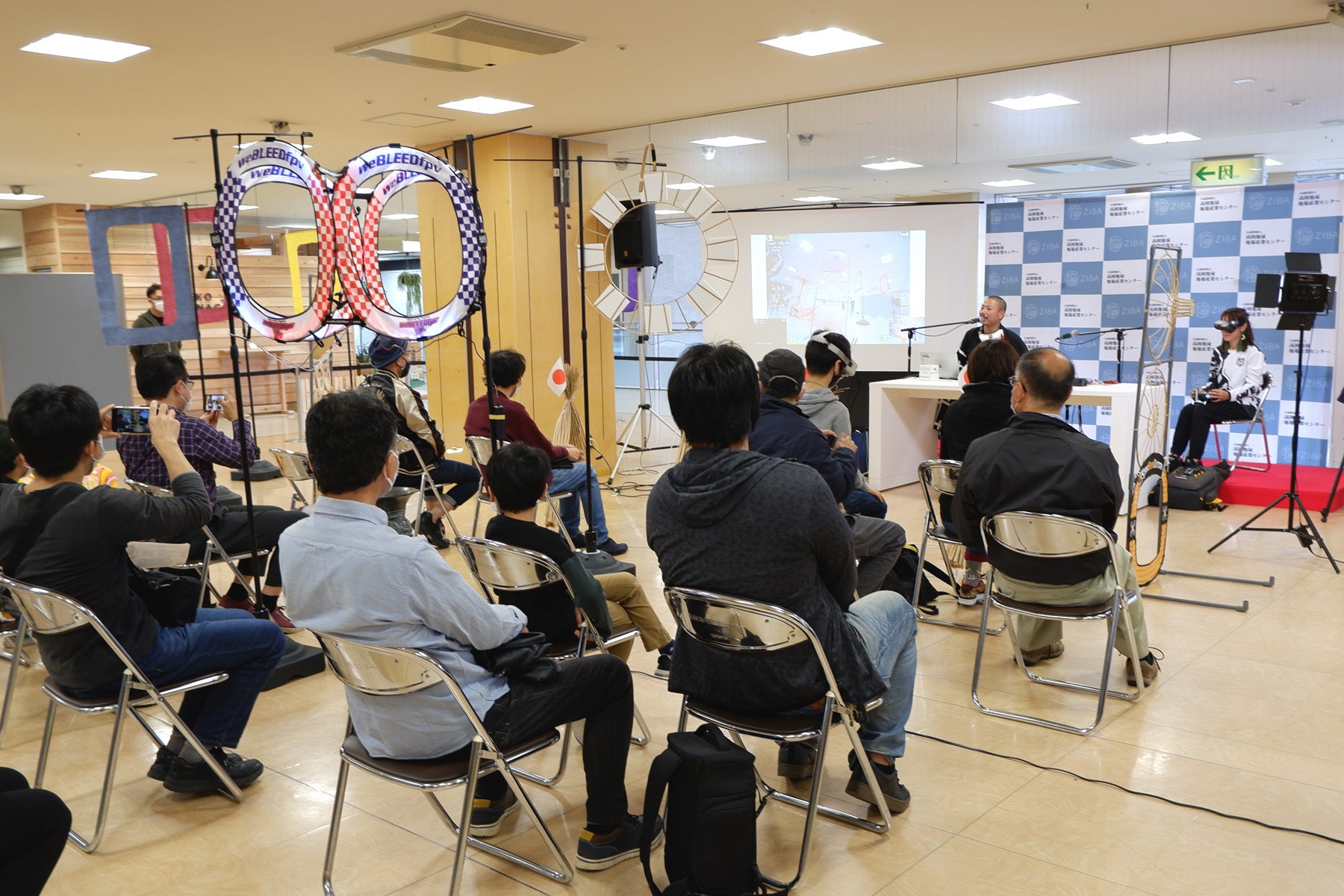 東京からドローンレーサーの白石麻衣さんをお招きしてトークショーとFPVマイクロドローンのデモ飛行を行ったほか、初心者ドローンの体験会も行いました。ドローン視点の映像はステージ横のスクリーンにも映し出され、会場の皆さんで共有。ドローンのカメラがお客さんを映し出すと、皆笑顔で手を振っていました。
