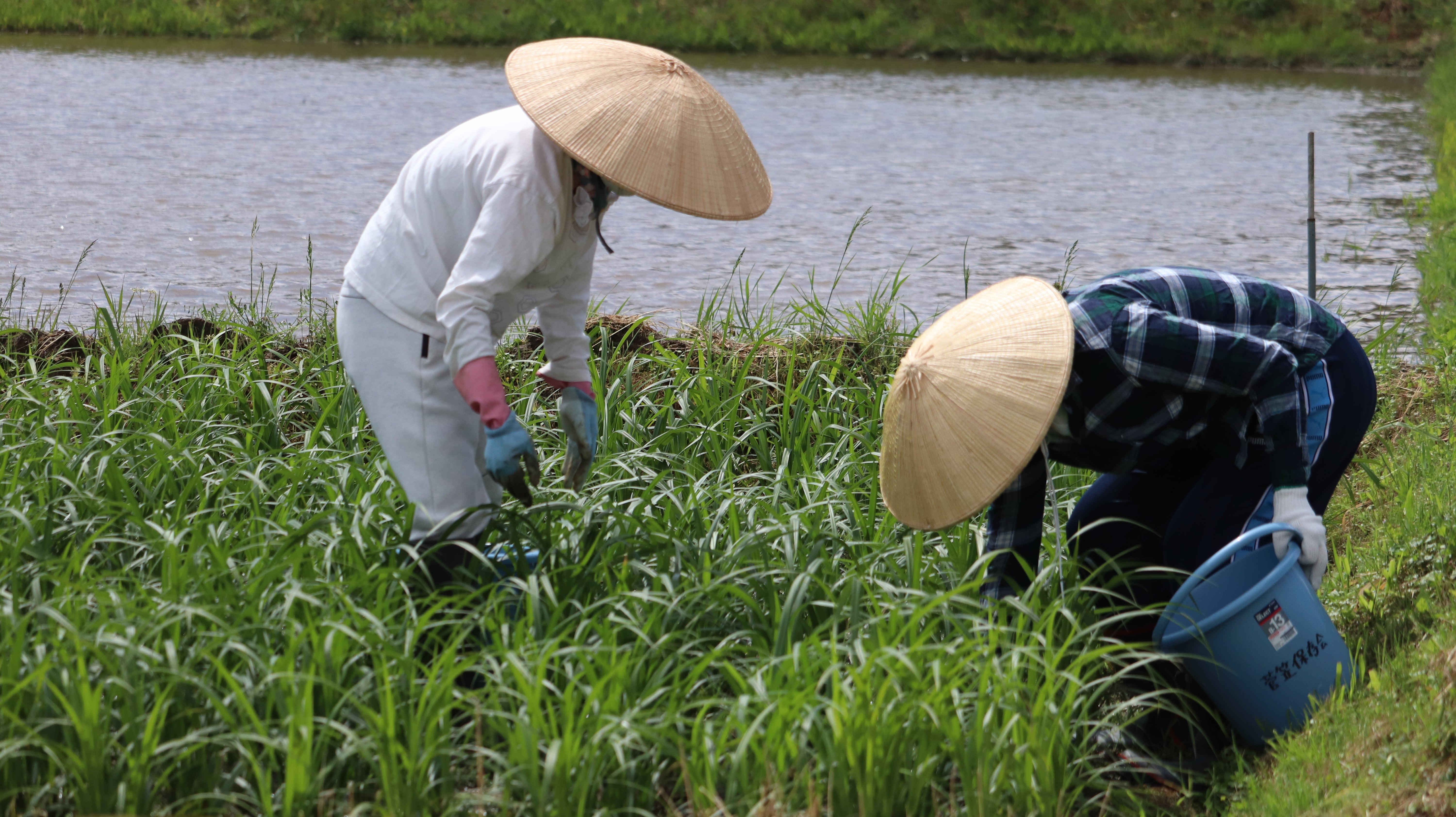 私たちは「越中福岡の菅笠」に携わっているので、ぜひこのクラウドファンディングを通して菅笠に興味を持っていただきたいと思っています。今回のクラウドファンディングオリジナル企画で「安藤有希子と行う菅田作業(芽欠き)体験」や「菅笠作家中山煌雲の講演と菅細工体験」をリターンに加えました。現在の菅笠業界の状況や私たちの取り組みを直接お伝えさせていただきます!菅のお世話には機械が使えないので、ほとんど手作業。こちらは「芽欠き」作業、不要な脇芽を手で抜いていきます。