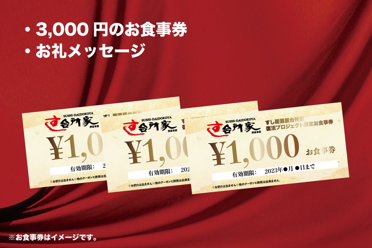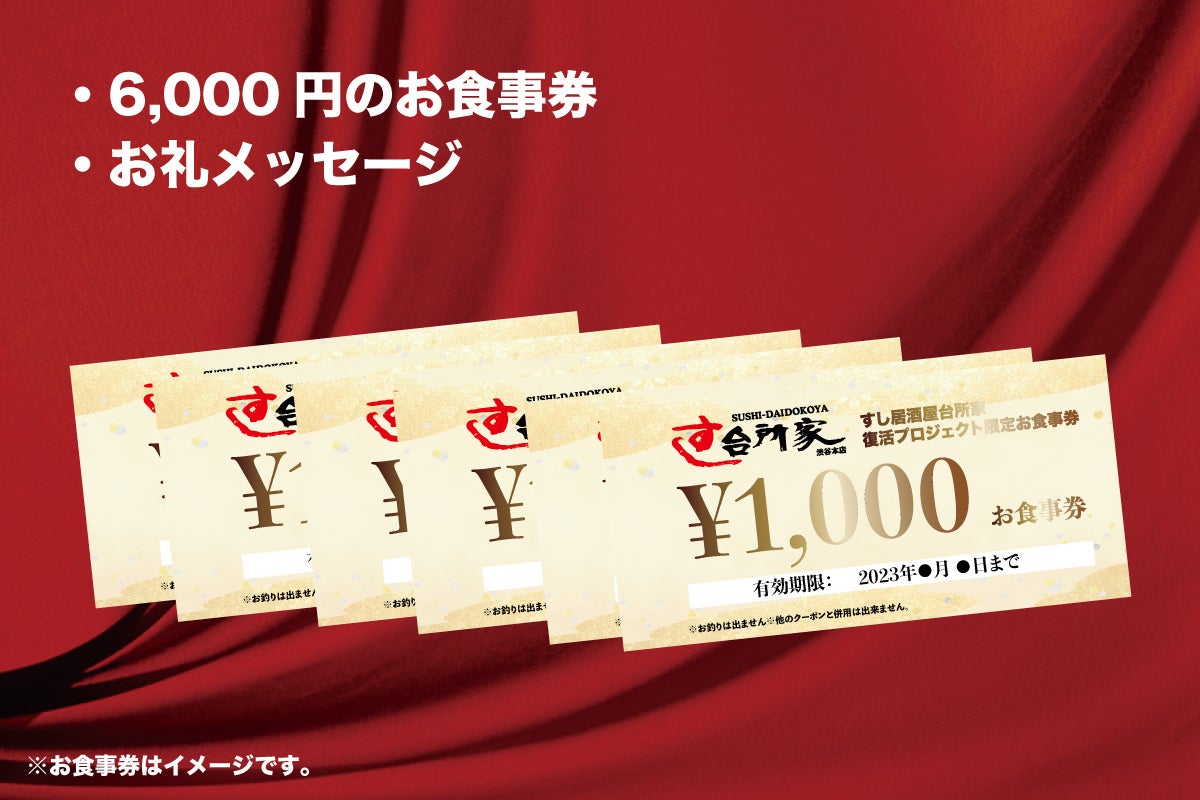 12,000円分のお食事券 + お礼メッセージ + すし台所家で利用していたオリジナル湯呑1個