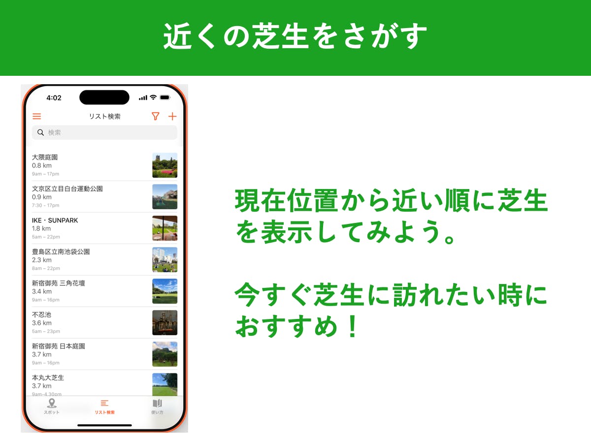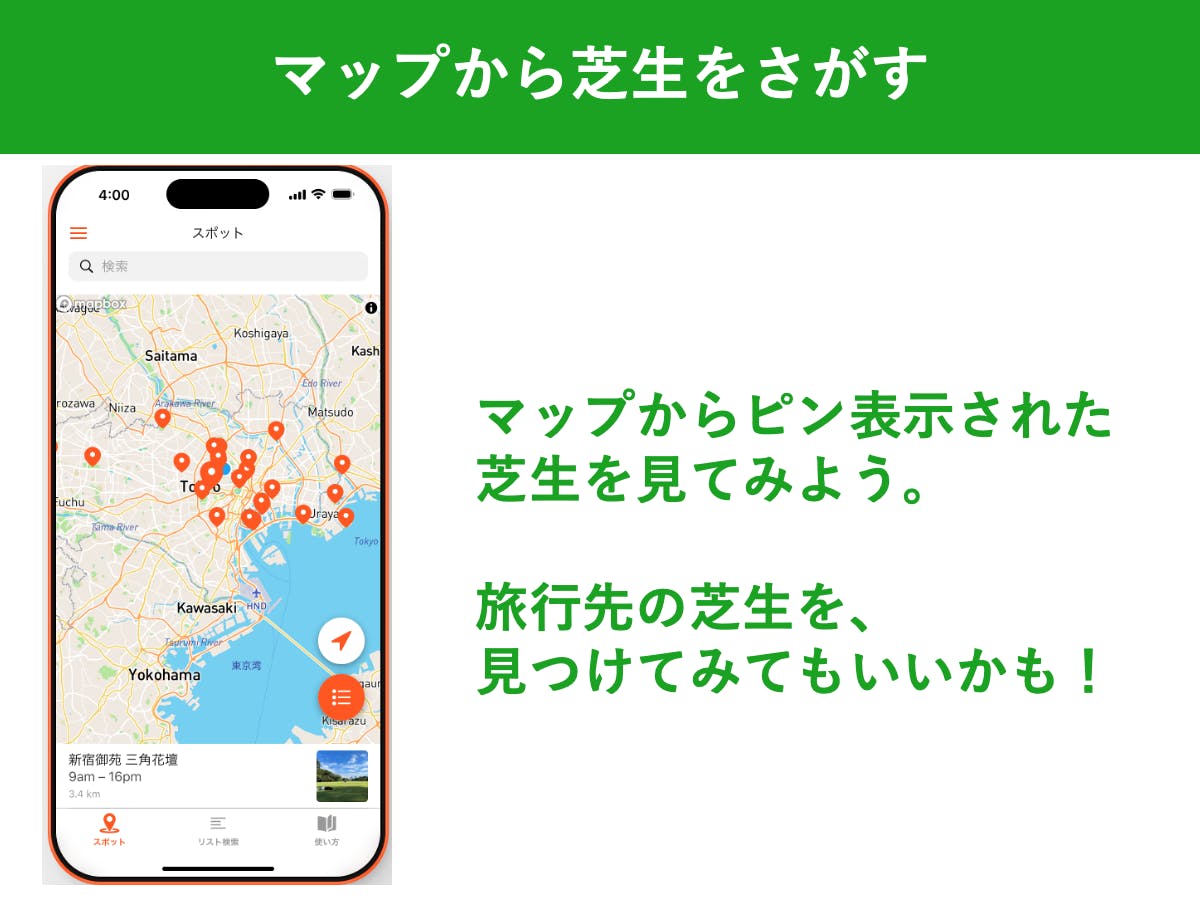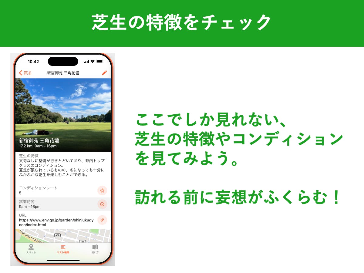 芝生好きの人たちに各地の芝生情報を登録してもらっていました。