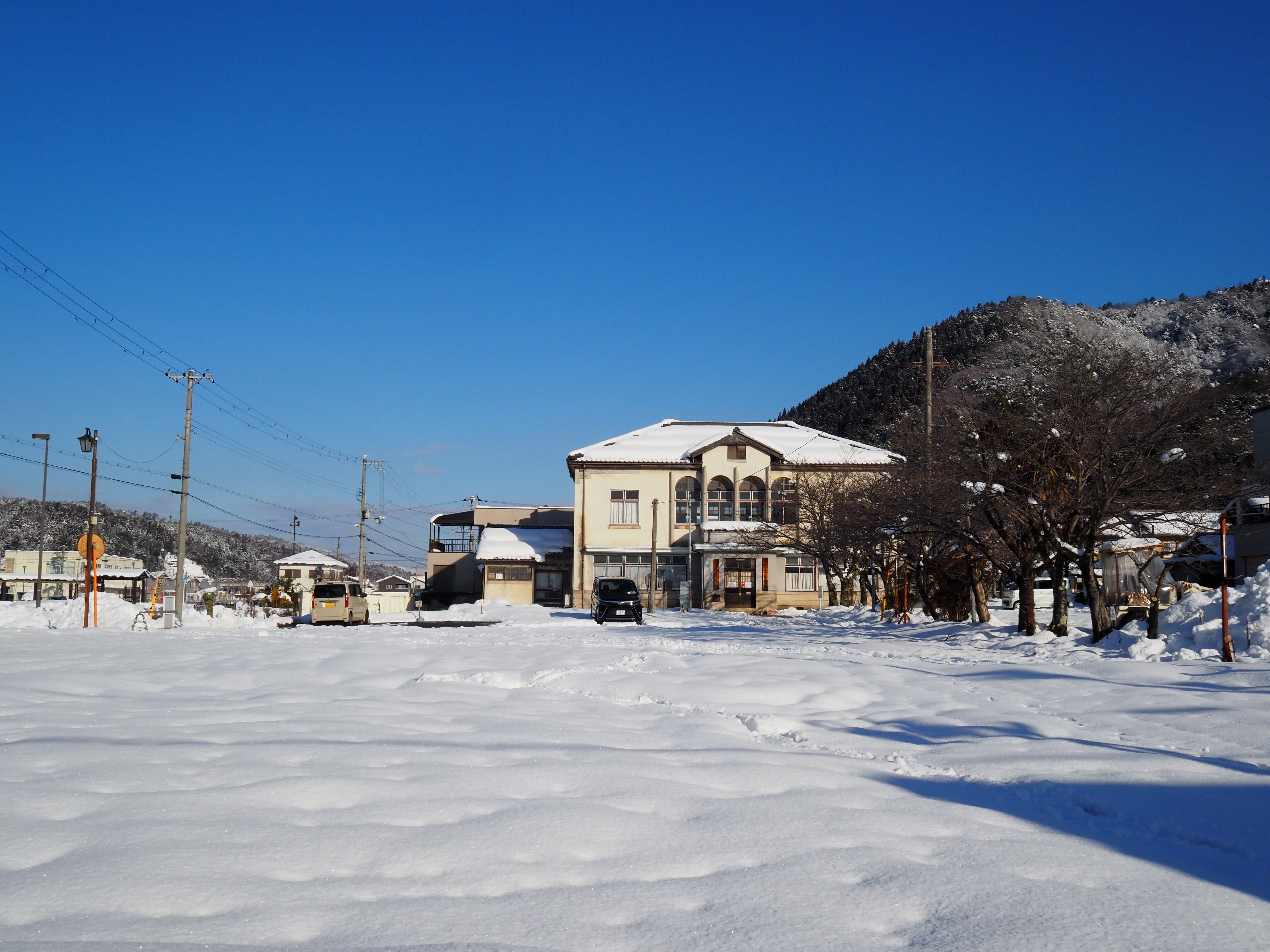 雪に覆われた江北図書館。ここ木之本から北は市内でもとても雪が多い地域です。