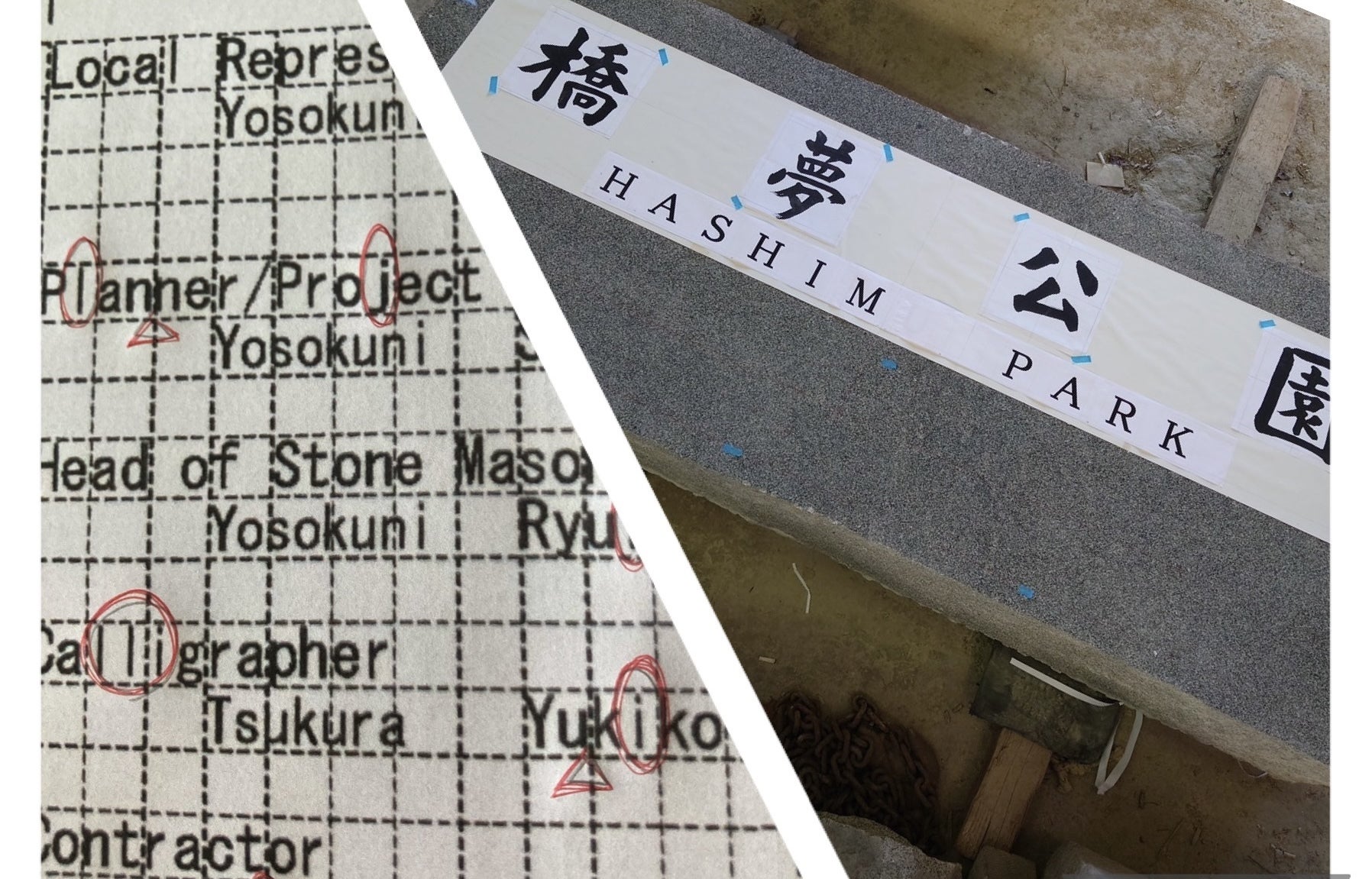 1週間前の活動報告で書きました、石の銘板の校正作業をまだまだ続けています。宮窪橋夢公園建設の国際的な背景から、日本語と英語併記で字彫を施します。そのため、書体の選定や字の大きさ、全体のバランスなどにも注意を払い、最終的には手作業で微調整をしていく根気の要る作業となります。今回字彫をお願いしていますのは、香川県で100年を超える老舗石材店(有)高橋石材さまです。これまた「やねこい」仕事にお付き合いありがとうございます。