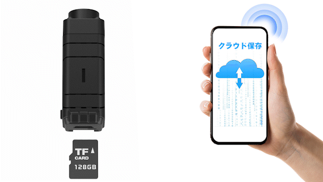 録画データの保存はTFカードとクラウド(有料)の2種類があります。TFカードは最大128GBに対応しており、クラウドはご購入のセットによって容量が異なります。「X-FANG」はループ録画方式で容量がいっぱいになったら、すでに録画されている中の古い映像に新しい映像を上書きしていきます。