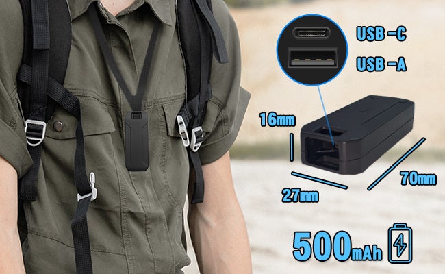 付属の500mAhのモバイルバッテリーは、重さ33g(ケーブルを含む)、サイズは70×27×16mmで、携帯性に優れています。ケーブルは柔らかいロープ式で、継ぎ目はモバイルバッテリーの中に差し込んで収めることができるので、首にかけても負担にならず、持ち運び楽々!