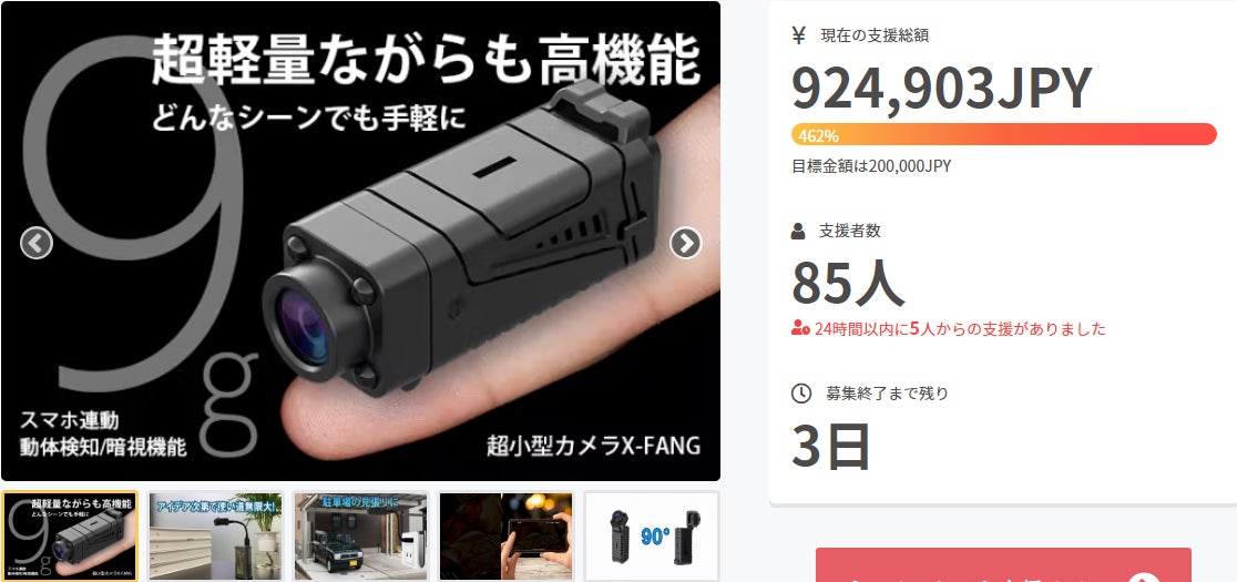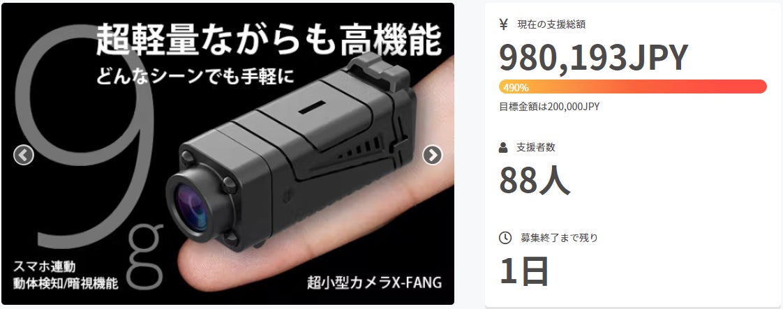 支援者の皆様こんばんは。超小型カメラ「X-FANG」の運営チームです。今年も残りわずかとなりましたが、 皆様、お変わりなくお過ごしでしょうか。さて、11月18日からの本プロジェクトですが、後1日間で終了いたします。36日間一緒に歩んでくださった支援者の皆様に感謝を申し上げます!プロジェクトURL:https://camp-fire.jp/projects/view/634339★「X-FANG」おすすめポイント★①指と同じくらいのサイズで持ち運び便利!いつでもどこでも録画でき、用途は無限大!②9gの超軽量でメガネや帽子に装着しても負担にならず、ハンズフリーで撮影者の視点から見るものを映像化!③APモード/WiFiモードの切り替えが自由で、ネット環境に関係なく録画の確認が可能!本プロジェクトはあと1日間で終了いたします!36%OFFの超超早割は4個しか残っていませんので、お得な価格で「超小型カメラX-FANG」を手に入れるチャンスを見逃しなく!!最後まで「X-FANG」プロジェクトをどうぞよろしくお願いいたします。 (^^)Polaris Trade「X-FANG」プロジェクト運営チーム もっと見る