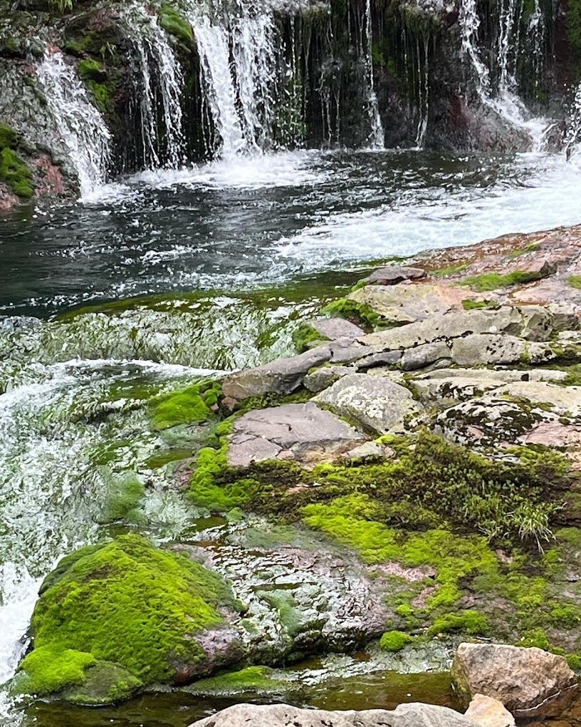 水が酸性のため岩が赤いのも特徴。苔が群生し、さらにその上を流れ落ちる水と合わせて、四季折々のとても美しい景色を見せてくれます。(天然記念物の貴重なチャツボミゴケも鑑賞できます)