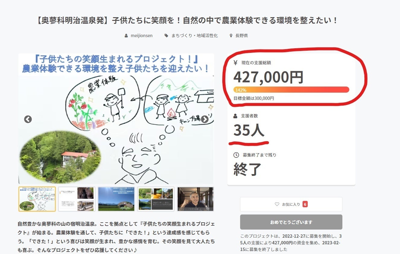 こんばんは。長野県の八ヶ岳山麓にある、山の宿明治温泉 代表鈴木です。おかげさまで無事クラウドファンディングが終了いたしました!これもひとえに応援してくださった皆様、ご支援くださった皆様のおかげです。心より感謝申し上げます。支援総額:427,000円支援者数:35名※詳細はこちらからご覧いただけます。https://camp-fire.jp/projects/view/634367支援いただいた皆様へ、順次ご連絡及びリターンのご対応をさせていただきますので、今しばらくお待ちくださいませ。そして、マイクロバス修繕・オートキャンプ場開設に伴う工事、および子どもたちを迎える準備等々、着々と進めてまいります。こちらのブログやSNSにて、活動を随時ご報告させていただきます。よろしければフォローお願いします。Instagramhttps://www.instagram.com/yamano_yado_meiji_onsen/facebookwww.facebook.com/meijionsen/また、『山の宿明治温泉』のオートキャンプ場開設に伴うお知らせやご利用・ご予約等詳細は、準備が出来次第ホームページにも掲載する予定となっております。www.meijionsen.jp/改めて、ご支援いただきまして誠にありがとうございました。『山の宿明治温泉』を引き続きよろしくお願いいたします。