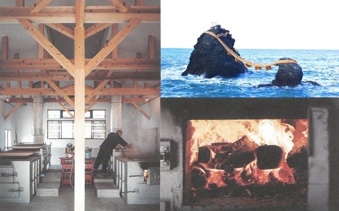 夫婦岩で有名な二見ヶ浦の浄らかな海水を汲みあげ、塩釜をていねいに薪で焼いて出来てくる天然の塩造り。
