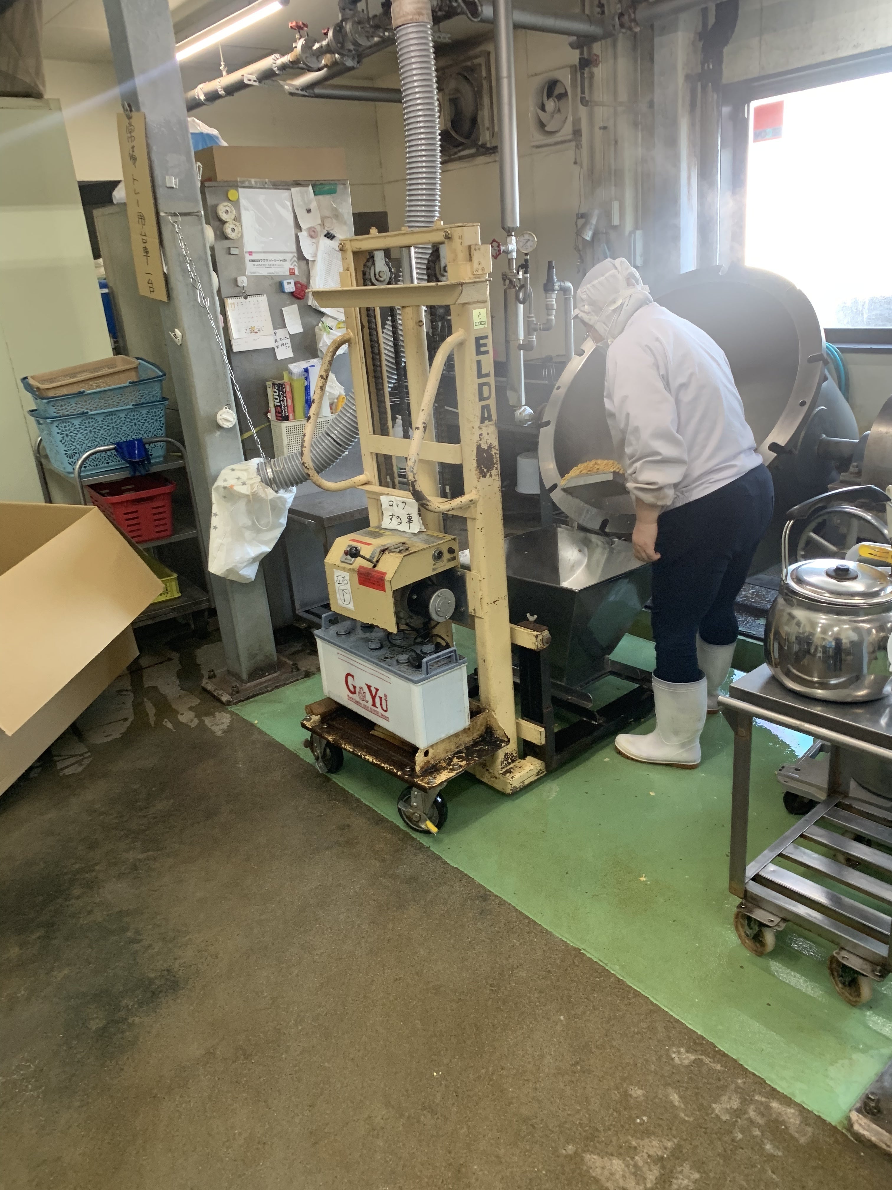 工場長(若おかみ)が釜から納豆菌をふりかけた蒸し大豆をスコップでかき出して豆リフトに入れています。豆リフトで、納豆盛り込み器のホッパーに移し、盛り込み器から納豆トレーに菌つき蒸し大豆を充填していくのです。