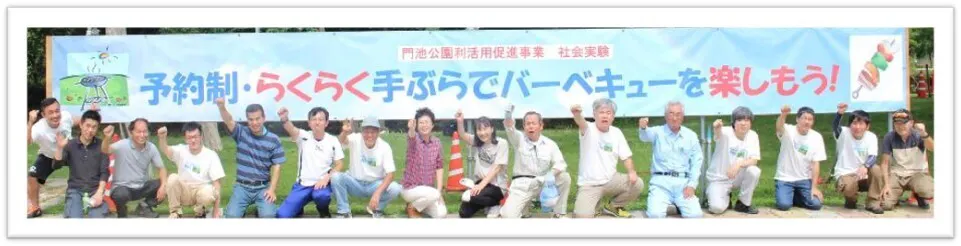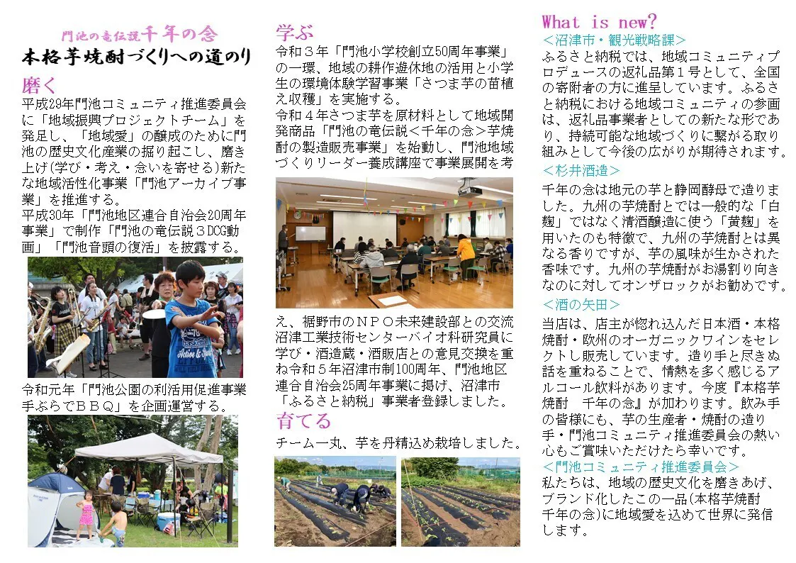 令和元年度、新たな地域活性化事業を継続していくためのコミュニティビジネス『手ぶらでバーベキュー』を企画しました。『手ぶらでバーベキュー』とは、地域資源である門池公園を活用しながらビジネスの手法により地域活性化を進める、地域を元気にする取り組みです。平成30年、市で官民協働の公共空間利活用のための「パークマネジメント」が施行され、令和元年、「沼津市民間支援まちづくりファンド」を資金に、地区のシンボル門池公園を活用した「完全予約制・手ぶらでバーベキュー」事業を毎年春・夏・秋に実施しています。 そして、令和5年沼津市制100周年、門池地区連合自治会25周年記念事業を検討し、令和3年「門池小学校創立50周年事業」の一環、地域の耕作遊休地の活用と小学生の環境体験学習事業「さつま芋の苗植え収穫」を実施した経験より、令和4年さつま芋を原材料として地域開発商品「門池の竜伝説<千年の念>芋焼酎の製造販売事業」を立ち上げました。