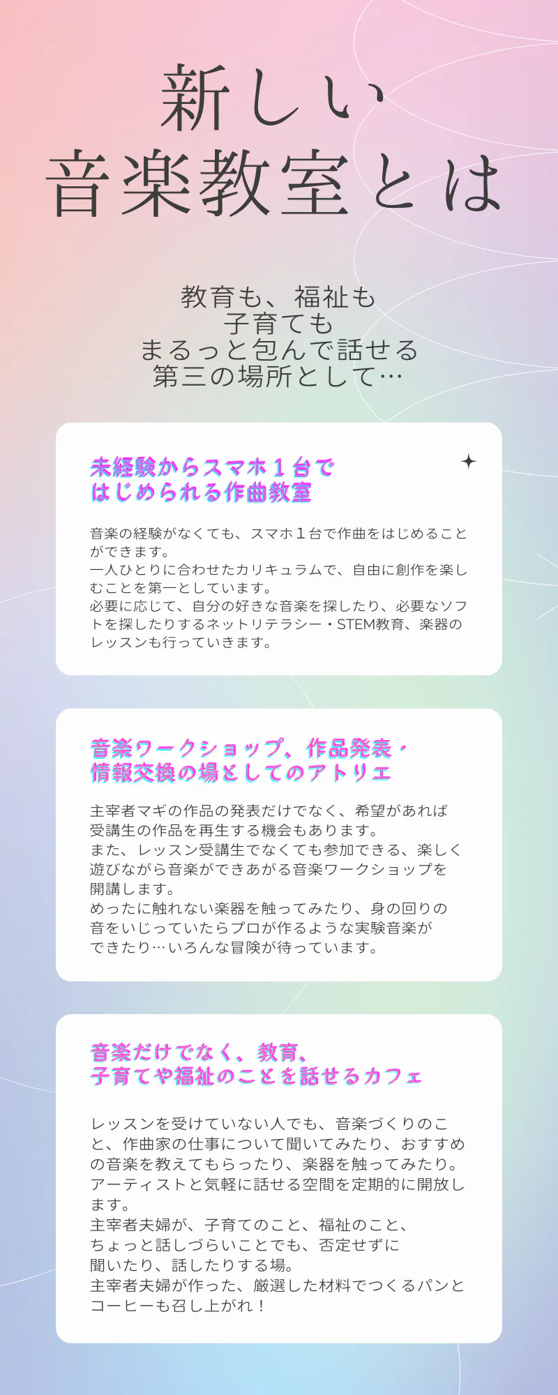 教室というよりは、音楽だけではなく、福祉や子育て、教育の話ができる、あらゆる人を受け入れるアトリエ・カフェ・教室の複合施設のような形になります。