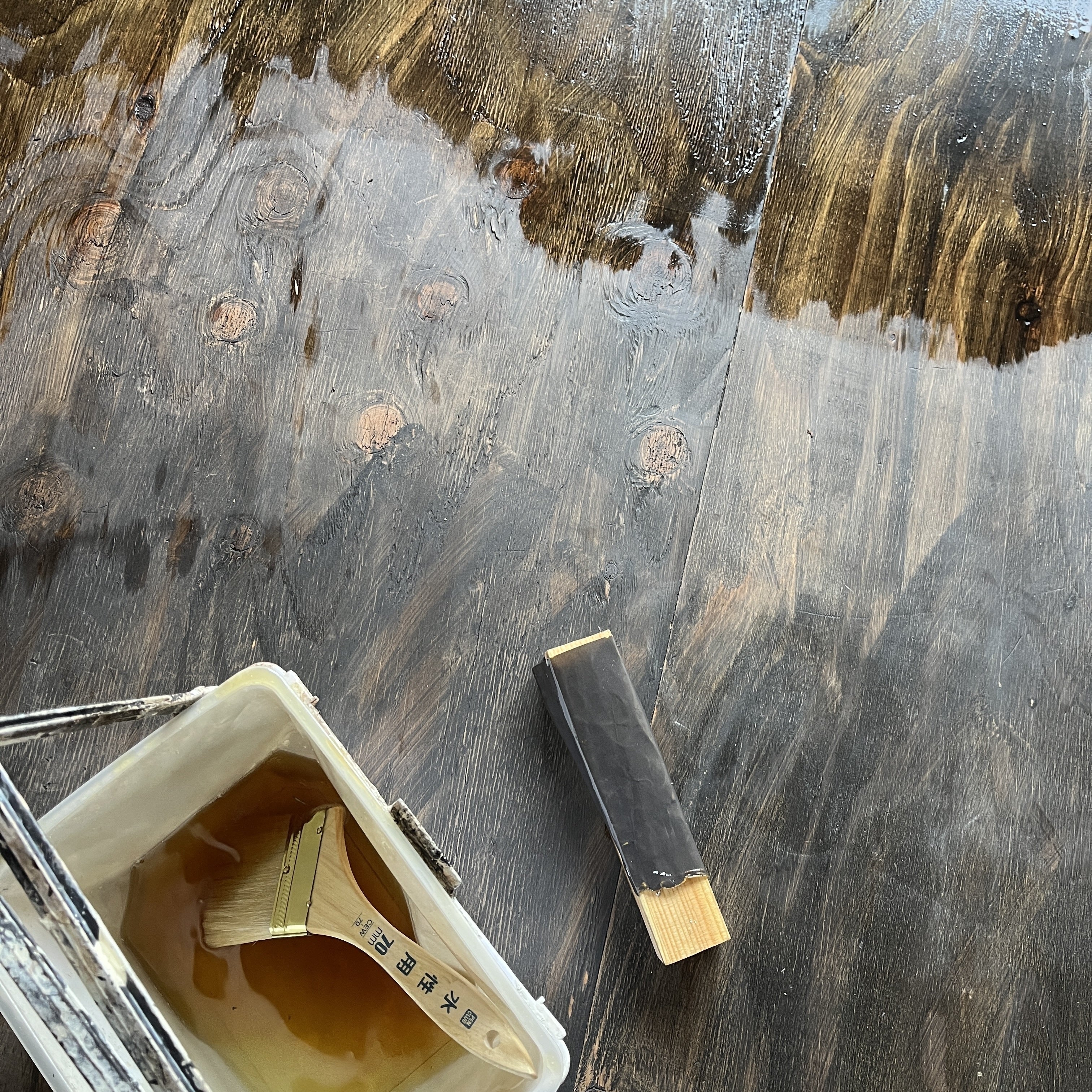 壁も床もはもちろん、金属かコンクリがベストだけど、それでは工期や予算がいくらあっても足りない。床は伝統塗料、柿渋の浸透力と合成樹脂の墨液の硬さを使ってできるだけ表面が硬くなるように。仕上げはワトコオイル。