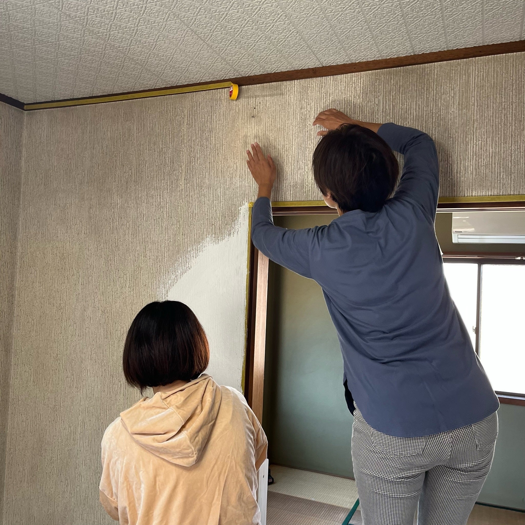 工事進捗、番外編。隣の住居棟も、実はご支援いただいているプロジェクトで補助的に使う場面があります。教室・カフェスペースでは落ち着けない人がクールダウンしたい時に、住居棟でクールダウンしてもらったり。もう少し話をしたい・聞いてもらいたい人がいたときに、ご飯を一緒に食べながら過ごしてもらったり。あるいは、アーティスト・イン・レジデンス的に使って、アーティストと若い世代との交流を促進したりなど。※アーティスト・イン・レジデンスとは:アーティストに特定の地域に滞在してもらい、作品制作やワークショップを行ってもらうことこちらはアドバイスをPOSのお二人にもらいつつ、友人にいろいろと手伝ってもらいました。まず、3Fの棟はカーペットもぼろぼろ、内壁が一部剥がれていたのですべて修繕。クッションフローリングを敷いて貼り付けました。次に、2F。ここは息子が過ごす場所なので、ベビーゲートをうまいこと設置するために下地づくり。そして、壁。壁は簡易モルタル調塗料「モルモル」を使っています。ホームセンターでも購入できます。これは、手で塗るだけで漆喰やモルタル風の壁を作ることができ、さらに間も少し埋めてくれるパテ的な役割も果たします。すごい。参加してくれた友人と楽しく塗りました!他にも、タイルへのコンクリートドリルでの穴あけからのランドリーパイプの設置、倉庫スペースの拡張、シャッターの鍵やドアクローザーの修理など、かなり手を加えています。こうして好きに手を加えられるのも、築年数がかなり古いことによる現状復帰義務無しでの契約とはいえ、家主さんのご理解と寛容な心遣いのおかげでもあります。神物件。あらためまして、お手伝いくださったみなさま、ありがとうございます!次はたったいま私ができるだけ進めている、教室2Fの劇的ビフォーアフターをお送りしたいと思います。4日後ぐらいには、たぶん…!