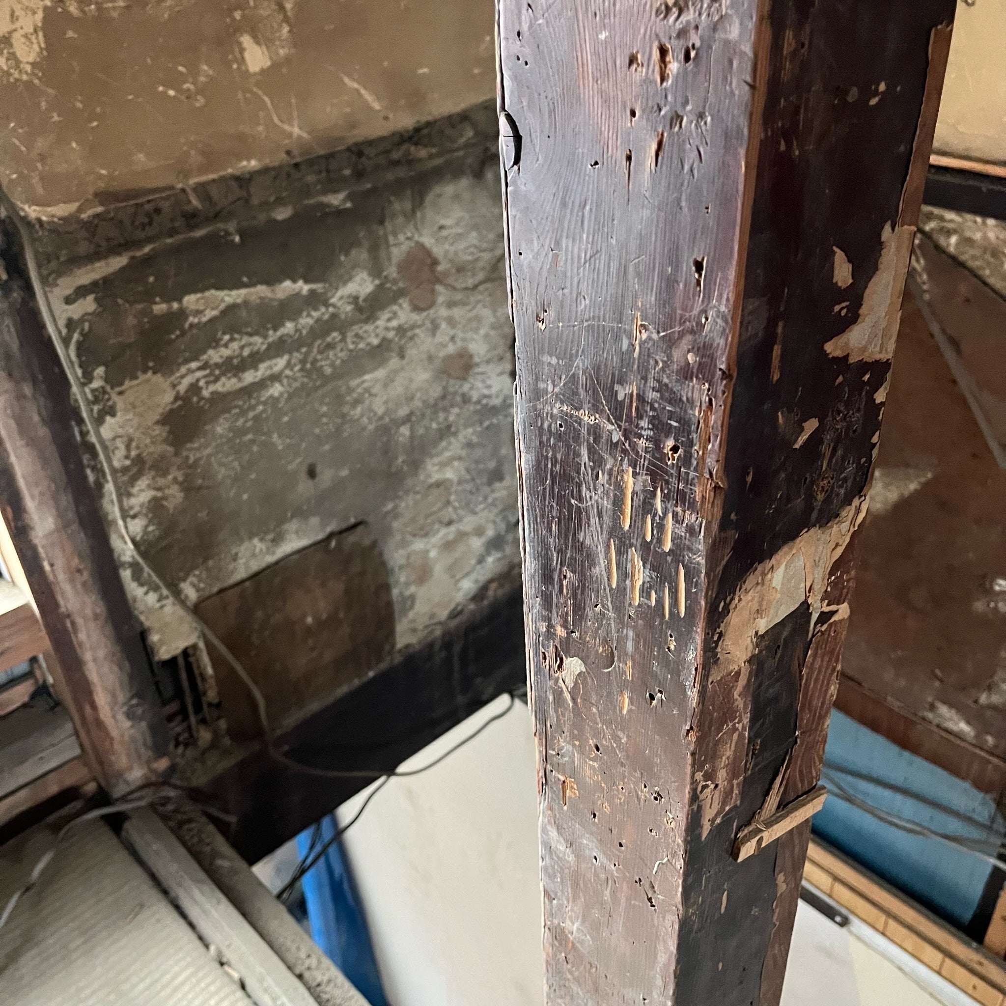 工事のつづきのはなし。謎の屋根。ホンマに謎でして。最初、「断熱材かなんか飛び出してるやん!なんか落ちてくるやつちゃいます?」と思いまして。。ここのスペースを使わないにしてもこのどでかいトタンが落ちてきそうで危ないと判断し、修繕をお願いしました。どうもここ、ベランダだった場所を過去何代目かの住人の方が延長したみたいです。伝わるかわかりませんが、下図のように屋根の上から屋根被せてる?って感じ。そもそも、ベランダも多分もともとなかった可能性さえある。どうもこれ、屋根の補助材なるものが丸まってほっとかれていただけとのこと。延長するときに邪魔になったのか、仕舞い込まれていたのか。。昔ながらのおおらかな手ぬき施工を感じます_(:3」∠)_撤去してふさぐ準備をしてもらったのですが、補助材の裏から屋根瓦が落ちてきたりしたそうです。よくある話ではあるみたいけど、落ちてきたらと思うと冷や汗かきます。まるちゃん、こんな危ないとこ施工してくれてありがとう。。その上、ここについては、家主さんも施工の補助をしてくださいました。現状有姿の契約にもかかわらず。大変ありがたい…!そういうわけで、ここはあとはふさぐのみ。バックリ空いているので、合板か石膏ボードでふさぐことになるかな?古い家の宿命、雨漏り跡もあります。ゆるいRPGにこんな顔の敵がでてきそうなデザインになってますが。。しかし雨がかなり降った日に建物内で作業していたのですが、たいへんラッキーなことに現状では雨漏りはなし!すごい。そこそこ前に住まれていた方が、全部和瓦からスレートに改装していて、そのときの恩恵もありそうです。しかしこれもそのままにしておくと気になるものではあるので、天井も少し修繕する予定です。続いては床貼り編を、また何日かあとにお送りします。