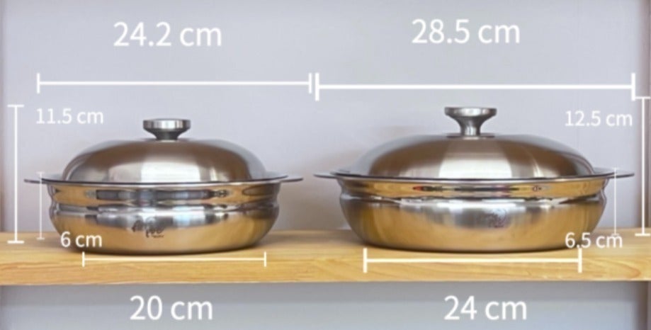 浅型鍋20cmと24cmは重ねてコンパクトに収納ができとても便利です。引き出しに入れるも良し、見えるところにディスプレーしても可愛いです。