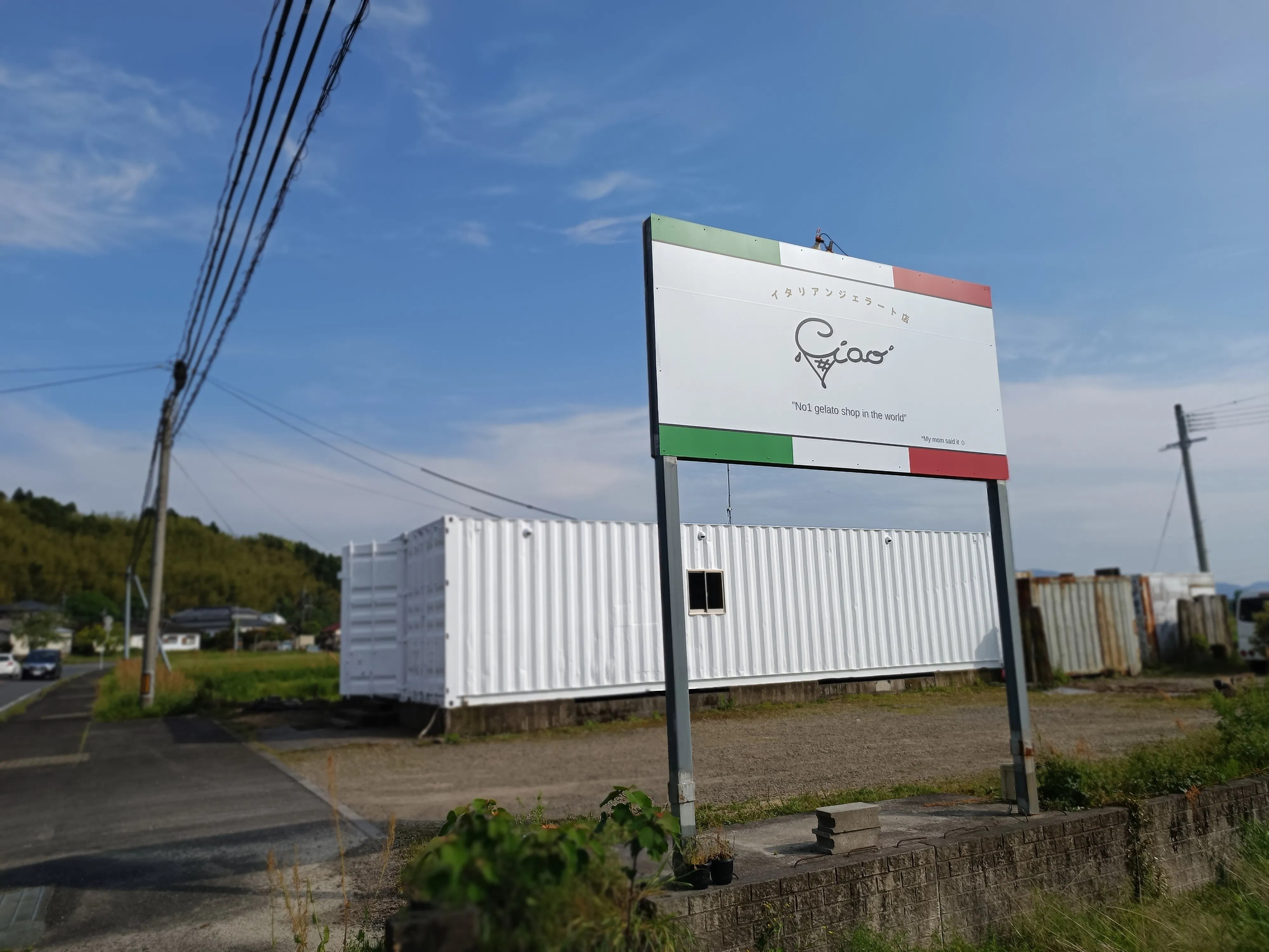 白いコンテナの前にイタリアの国旗を強調したデザインの看板です!!