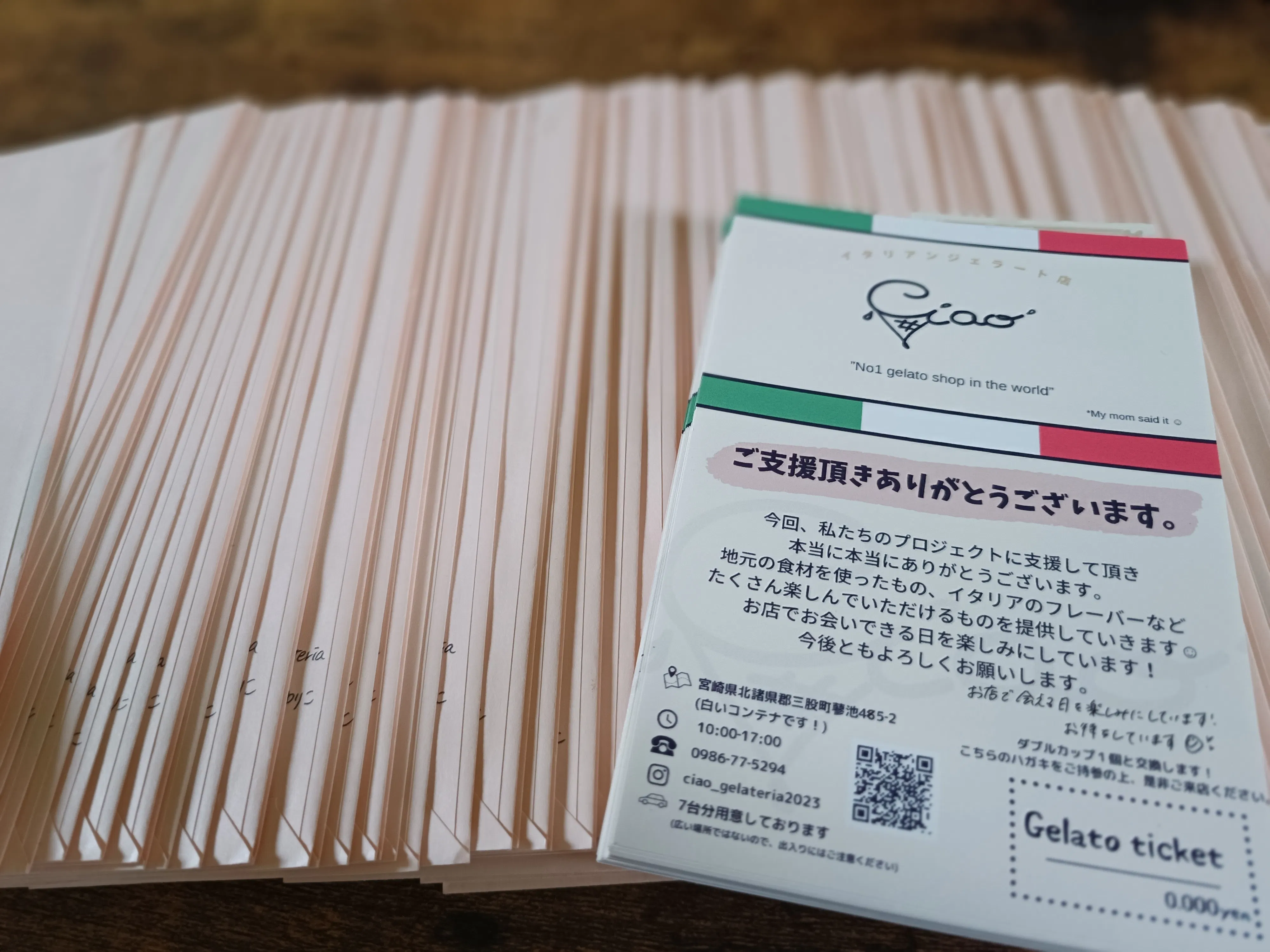 昨日と今日で【3,000円】【5000円】【10,000円】を支援してくださった皆さま、計134名様にハガキorジェラート券を発送しました。