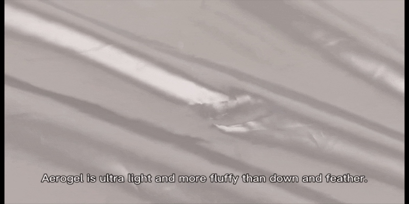 エアロゲルはの液体窒素を噴射しても、全く凍らないという革命的な新素材です。この新素材によって動物性の素材は一切使うことなく、驚きの暖かさを生み出します。