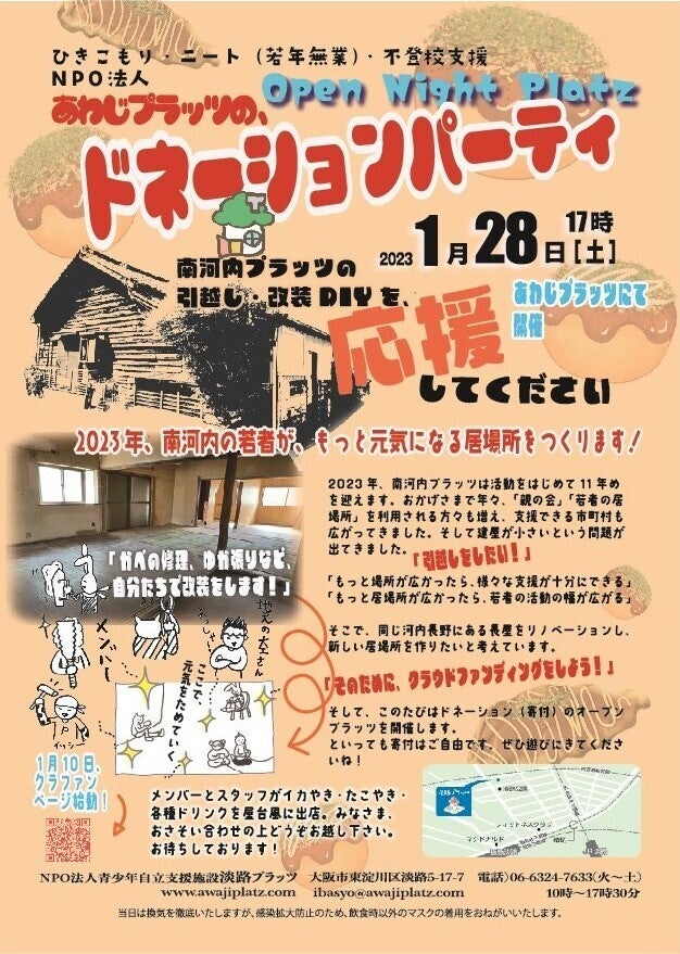 オープンプラッツとは、プラッツの居場所メンバーが、来てくださったプラッツ関係者の方々をおもてなしするというイベントです。コロナ禍前は、年1回程度定期的に行っていたのですが、ここ最近は開催できませんでした。今回、<南河内プラッツ引っ越し・改装クラウドファンディング>をきっかけに、復活します!当日は、南河内プラッツの引っ越し先の紹介動画を流したり(これも、南河内の居場所メンバーが撮ってくれました)、イカ焼き・たこ焼き・各種ドリンクなどで、以前と同じくメンバーとスタッフが協力して皆さまをおもてなしします。お近くまでお越しの方・お時間の許す方はぜひ遊びにきてくださいませ♪日時:1/28(土)17:00~場所:NPO法人淡路プラッツ(大阪市東淀川区淡路5丁目17-7)連絡先:06-6324-7633皆さまのお越しをお待ちしております♪♪