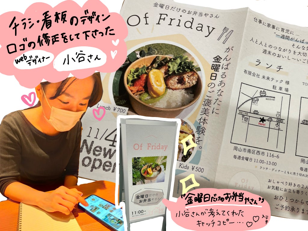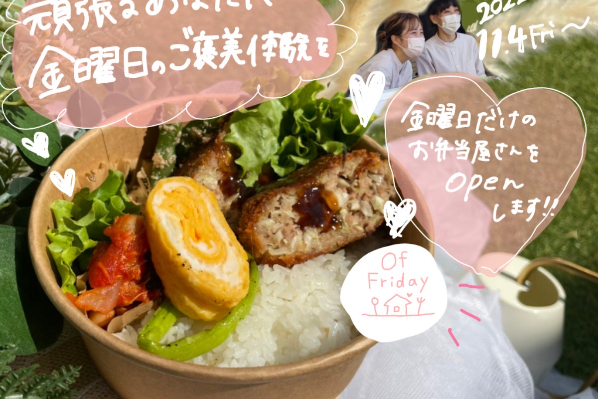 2022年11月4日に「頑張るあなたに金曜日のご褒美体験を」をコンセプトとして、岡山市でテイクアウト専門のお弁当やさんをオープン致します。