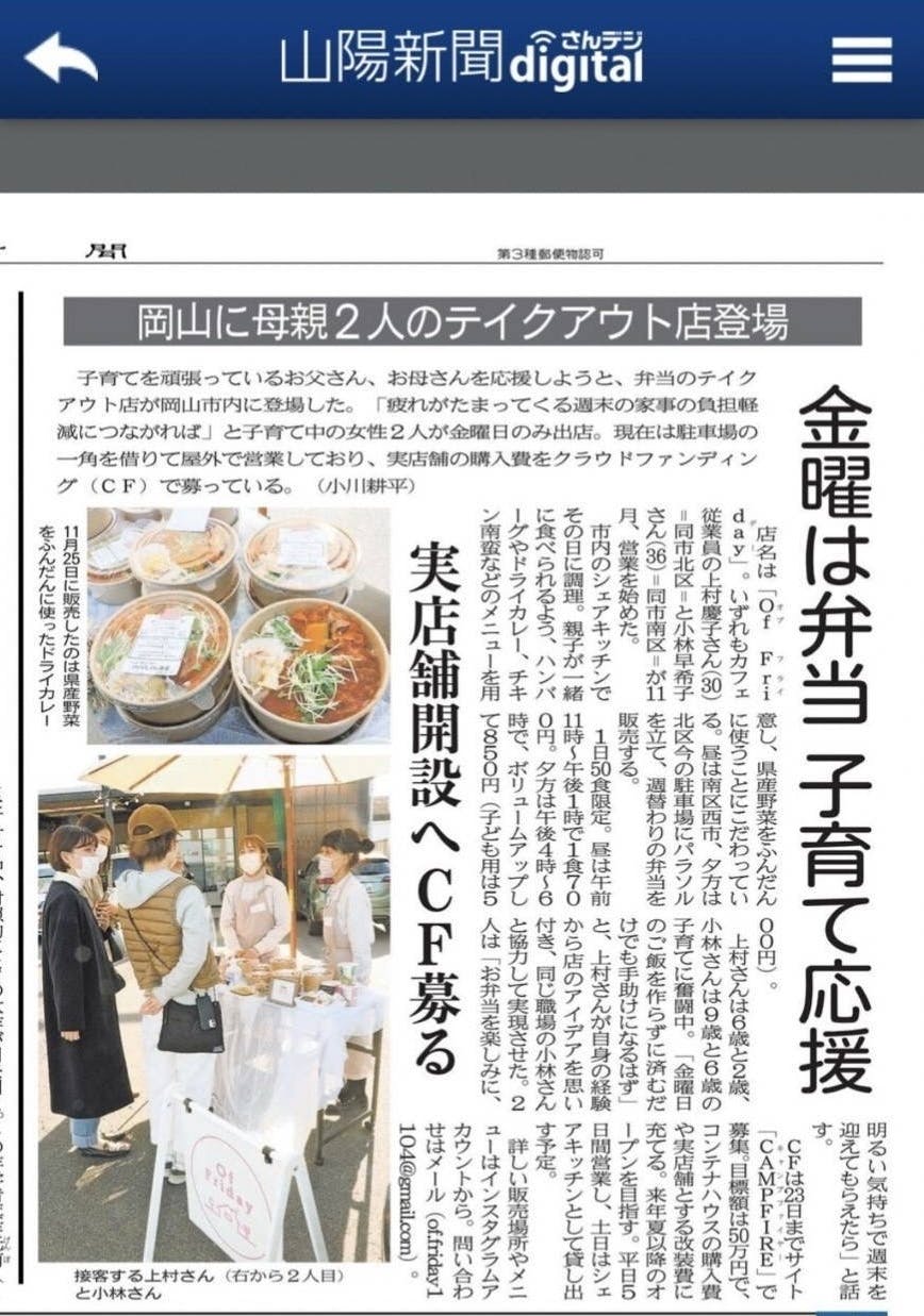 2022/12/20 21:16こんばんは!早いものでこのクラファンもあと3日となりました!これまでご支援いただいた方々、見ていただいた方々、本当にありがとうございます!最初はこんなに多くの反響をいただけるとは思っていなくて、いいな、と思ってくれる方が1人でもできたら嬉しいな。想いを知ってもらえるきっかけになったらいいな。と思ってこちらをアップしました。コンテナの購入費の募集でしたが、「支援してください!お金いるんです!!」というつもりはなく、いろんな事のきっかけになればと思っていました。こちらを通して知って、お店に来てくださった方、お店でクラファンを紹介させてもらってご支援してくださったお客様、このサイトでOf Fridayを見つけて記事にして下さった山陽新聞様、さらに現在企業様からもありがたい機会を頂き、どんどん輪が繋がって広がっていっていることをとても嬉しく思っています。本当にありがとうございます。残り3日ありますが、現在33名の方がご支援してくださり、22万円のご支援金が集まっています。御協力の大きさに責任を感じながら、応援をしっかり力に変えて還元できるように今一度気を引き締めて行きます!現在補助金申請に向けてもコツコツやっています。そろそろ実際にコンテナや厨房機器、デザイン、施工など考えていきます。23日はクラファン締切日であり、年内最終営業日です。ダブルで区切りのつく日なので、2022年走り抜けるぞ!という思いです!営業日はいつもとってもバタバタで、写真のようにリュックを下ろす時間さえ惜しい時も多々笑。でもお客様への感謝の気持ちや、届けたいサービスなど、バタバタしていても大切なことは忘れないようにします!! もっと見る