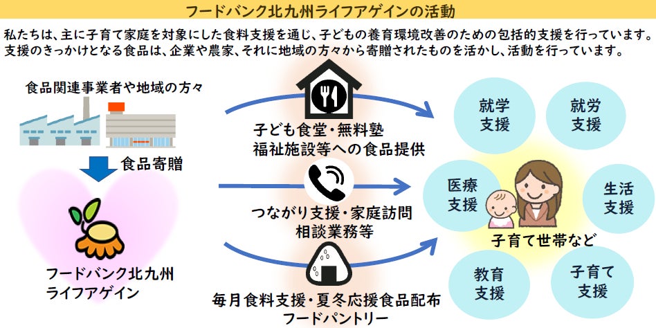 ライフアゲインのミッションは「生まれ育った環境のために、満たされた食事ができない、十分な教育を受けられない、寂しい思いをしている子どもを、北九州市からゼロにする」こと。この活動を北九州市から全国に広げていきます。食品ロスを削減するフードバンク事業と、食品ロスを活かす福祉事業(子ども食堂、子育て世帯支援、学習支援、子どもの養育支援、困窮者支援など)を行っています。