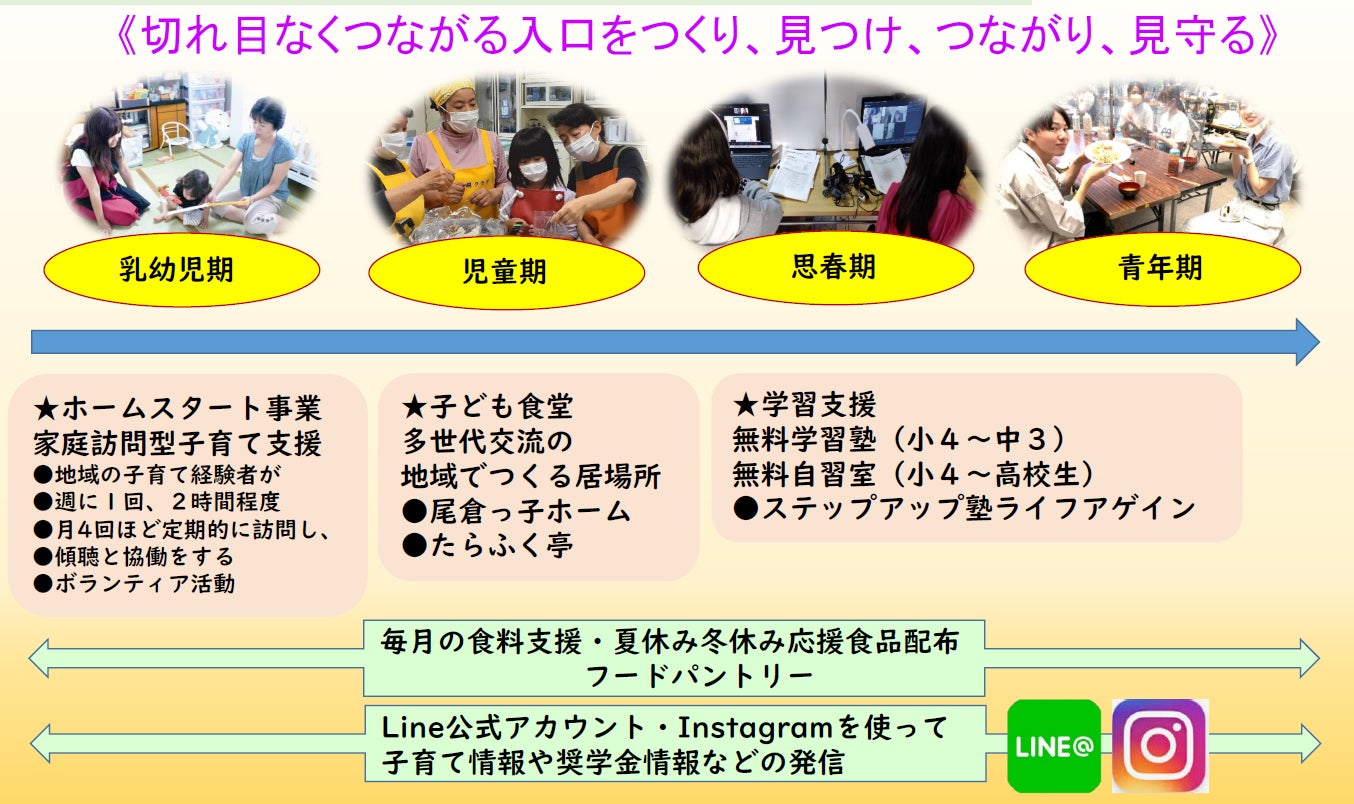 特に乳幼児期~児童期の子どもの養育環境の改善に尽力し、青年期まで切れ目のない事業展開をして、つながり・寄り添うことを重要視しています。