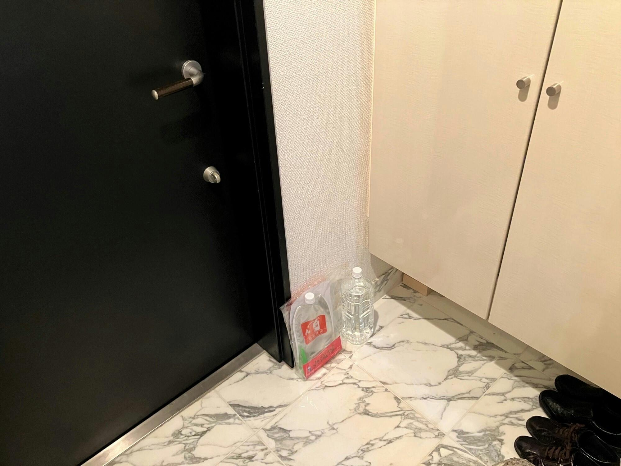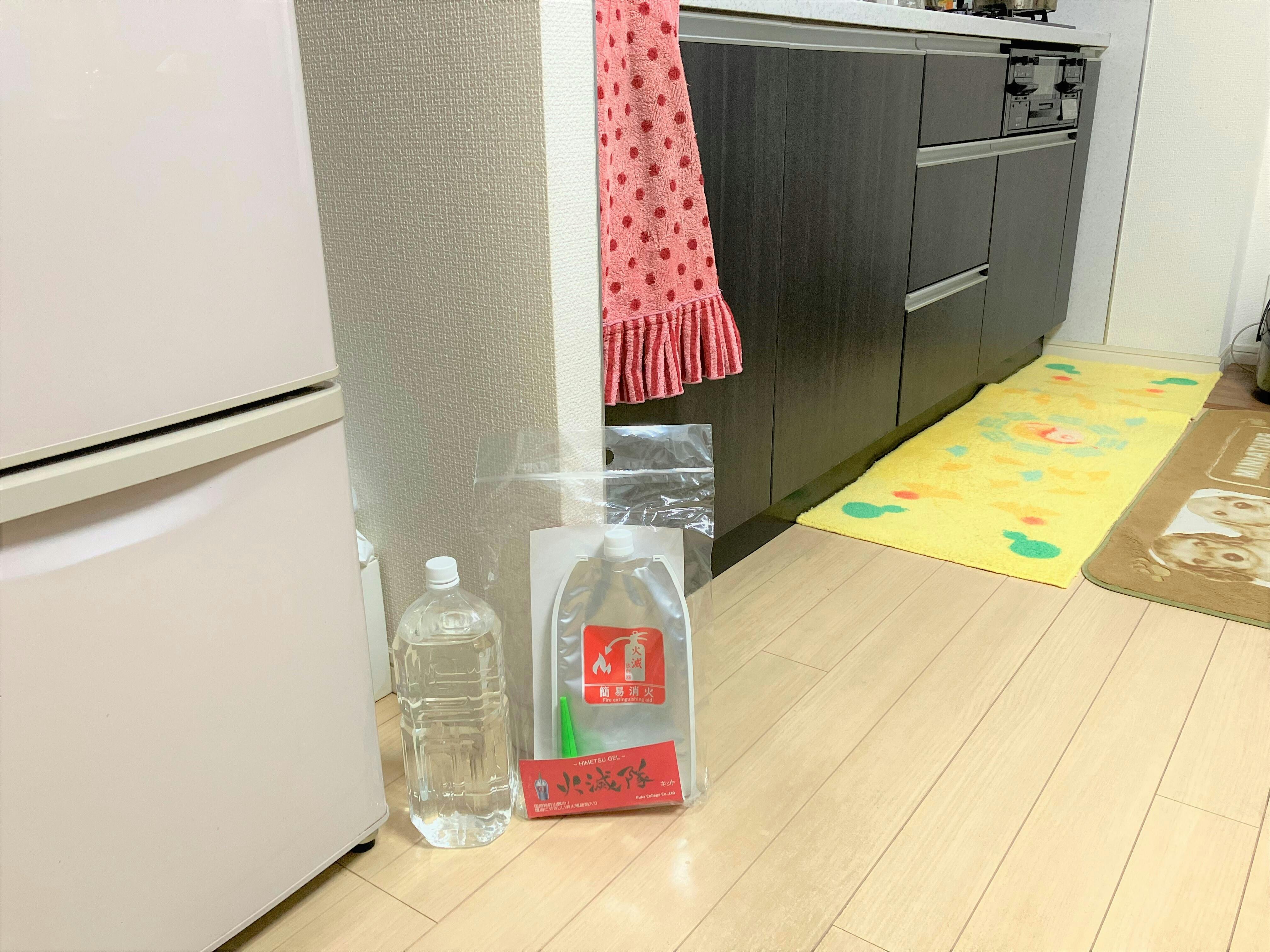 ご家庭で火災が発生したら、まず水を探しますので、火滅隊を水道近くか、2ℓの備蓄水に引っ掛けて各お部屋に設置しておきます。