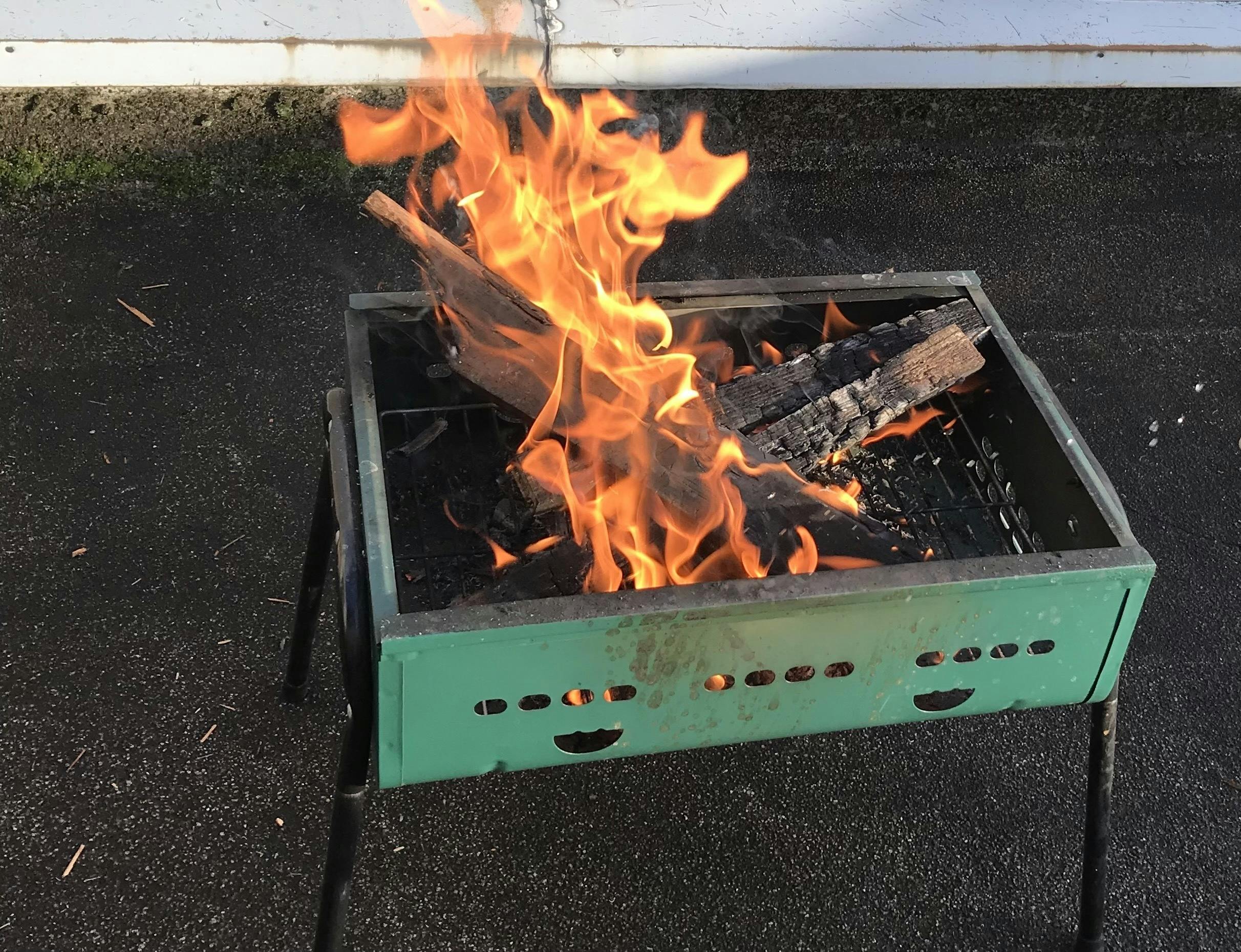 火滅隊放射器に水を入れて数回振り、コーンをつけて消火します。最初に備蓄水をかけて消火し、その後落ち着いて火滅隊に水を入れて、燃えた個所にかけておくと再燃の可能性が少なくなります。詳しくは動画をご覧ください。