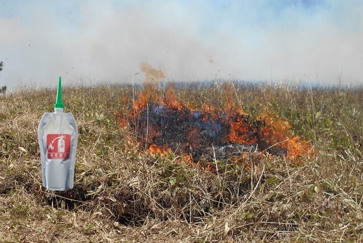 水を固めるゲル剤はフルーツゼリーなどで身近な食用の増粘剤を使っています。森林に残っても数か月で生分解し消滅しますし、動物が食べても安全です。このゲル消火剤をたくさんの人に知ってもらい、身近な火災に役立てたいことから、家庭用と地上消防隊向け消火剤を開発しました。