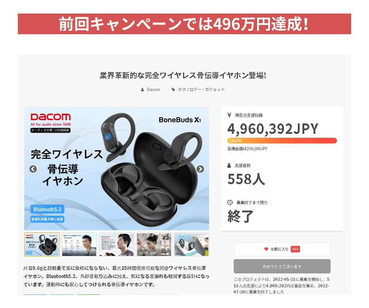 前回のキャンペーンで496万円の売上を達成した完全ワイヤレス骨伝導イヤホン(BoneBuds X1)が、たくさんのご要望を受けて、帰ってきました!
