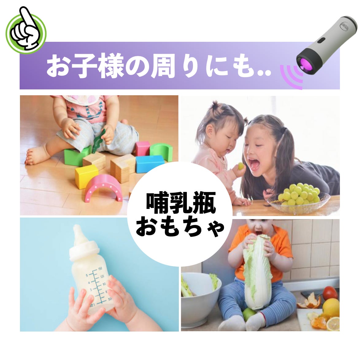 お子様が口に入れてしまう様々な用品、食品の表面を除菌して、