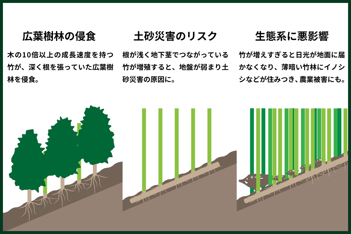 私たちが、竹くつを作り、実現したいのは竹が放置されない社会です。日本では近年、竹林が整備されず、環境に悪影響を及ぼす竹害が深刻化しています。