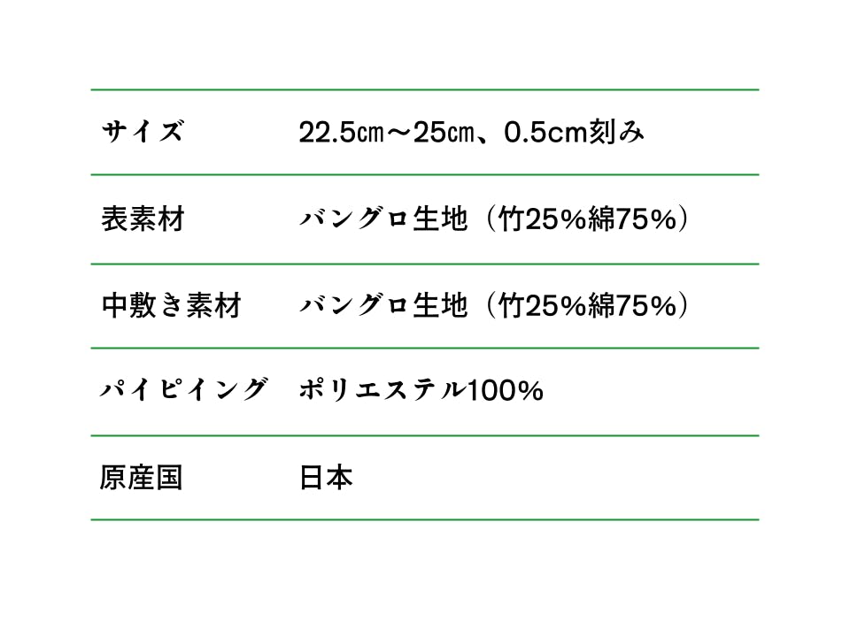 消臭性・脱臭効果をもつ竹布を中敷き部分にも使用しています。これにより嫌な臭いが残りづらく、快適にお履きいただけます。サイズは22.5cmから25cmまで0.5cm刻みで展開しています。