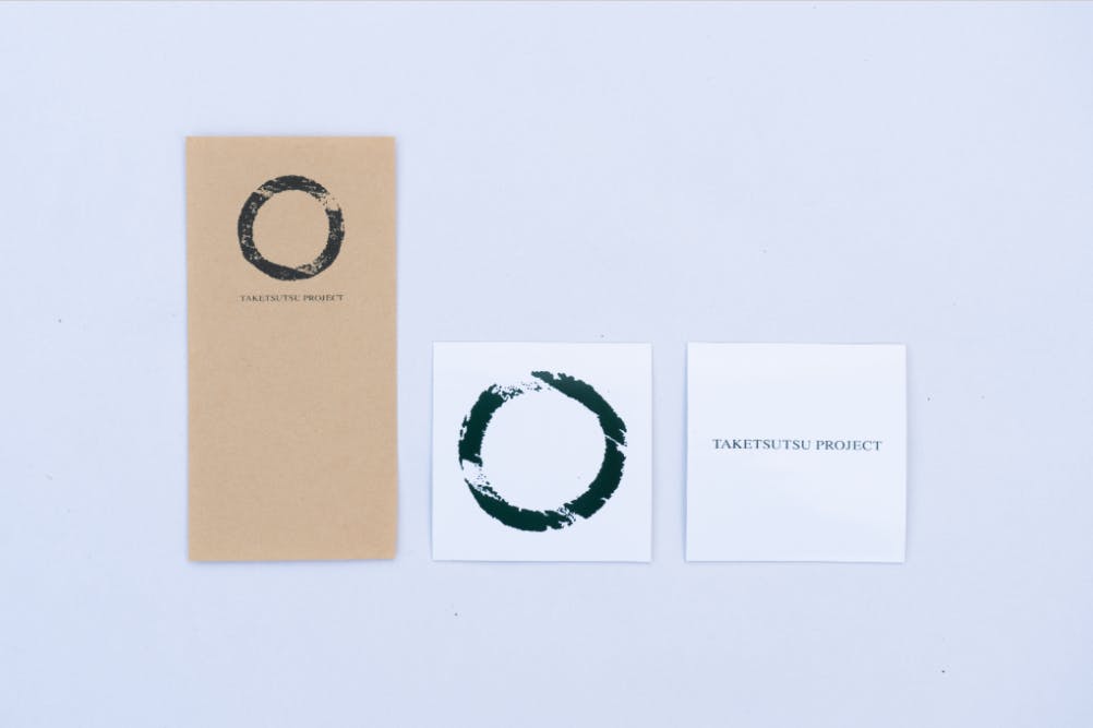 竹紙ショップカード、竹の輪ロゴステッカー、竹つつプロジェクト英字ロゴタイプの3点のリターンになります。
