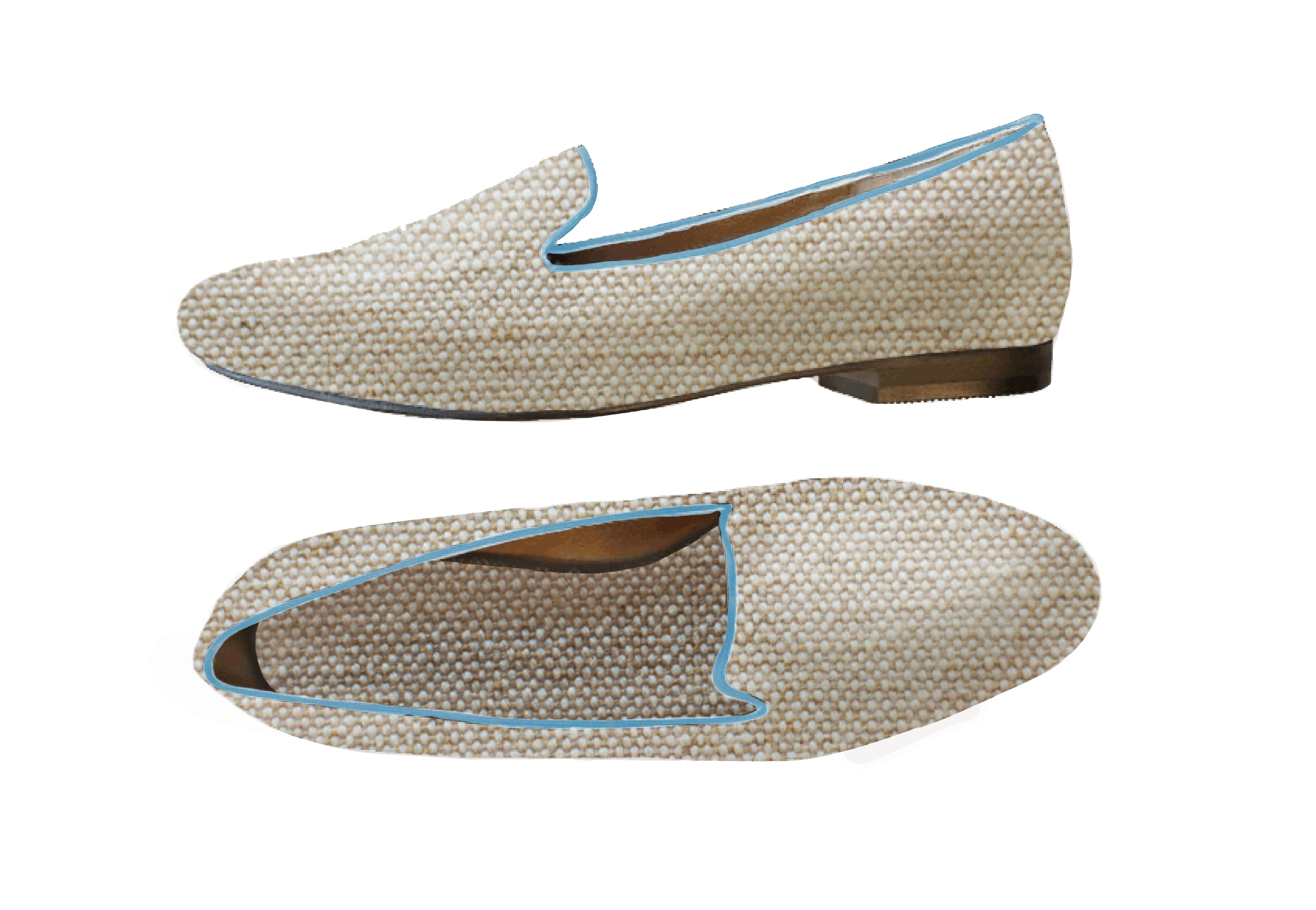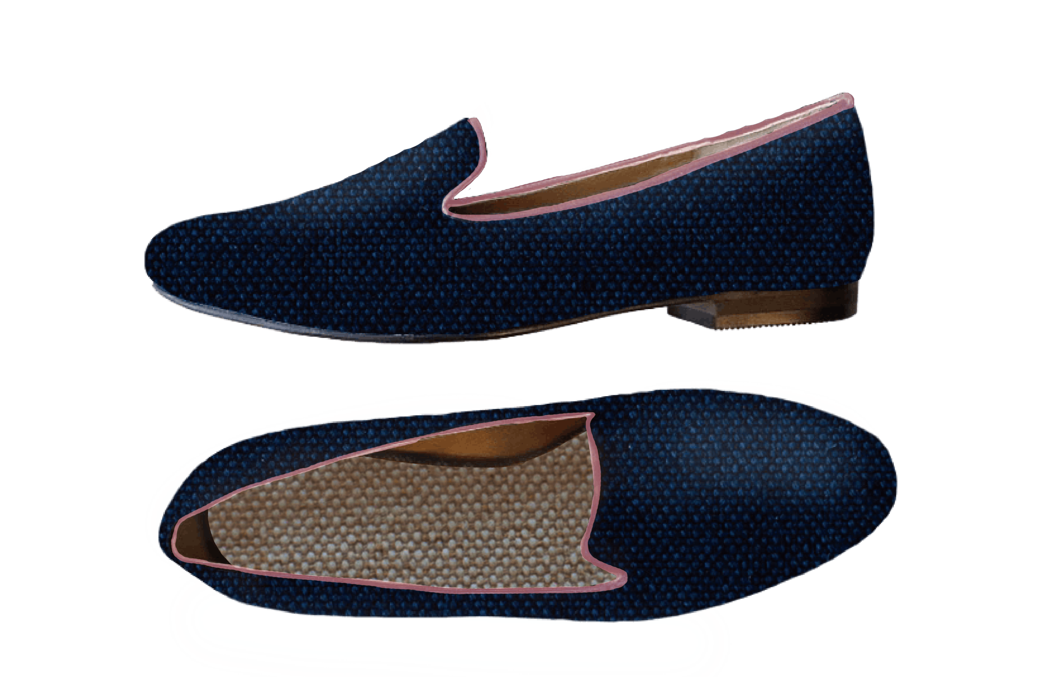 竹くつはキナリ・ネイビー・カーキの3色のボディに、白・黒・ピンク・黄色・オレンジ色・水色の6色のパイピングをみなさまから選んでいただき、お作りします。くつの型は京都で使用されずにいる着物や帯で靴をアップサイクルして製造する、Relier81さまにご協力いただきご準備しました。職人さんの手作業で作られた靴は、高級感たっぷりで履き心地抜群です。