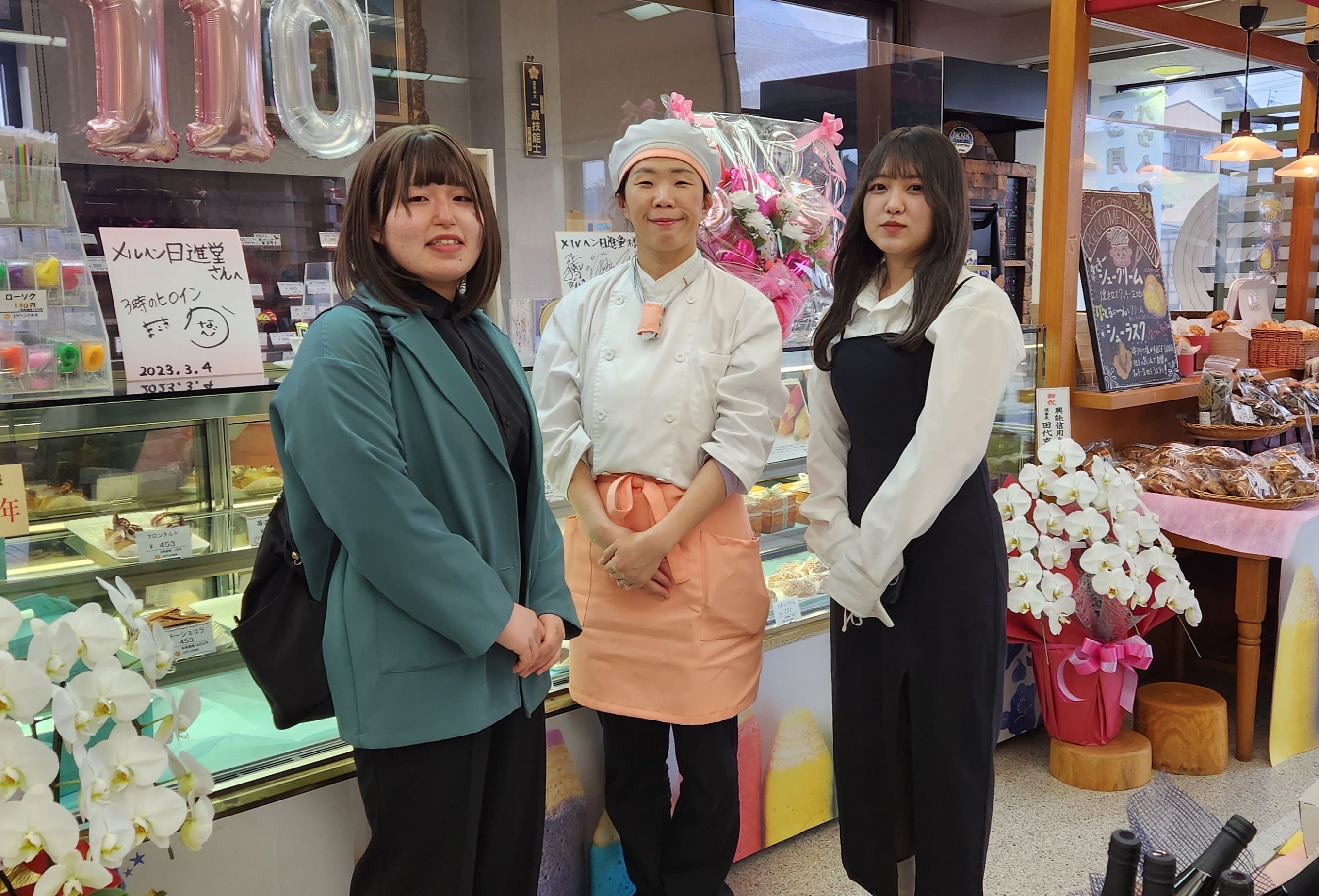 私達は昨日メルヘン日進堂さんにお邪魔し、お土産を購入してきました!写真はその時に石塚さんと撮った写真です。