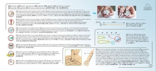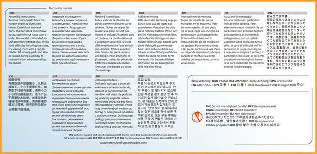 組立て部品はブロックごとに構成されており、小さな部品を組み合わせていくことで1つのモデルが完成します。組立て方法については、簡単な絵と段階別に11か国語での説明があります。