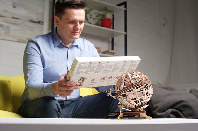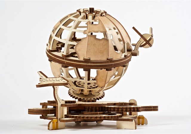 「メカニカルアース」は二つの大陸を持つ地球を模したモデルで、好奇心をくすぐる回転メカニズムと興味深い小さな部品達が備わっています。全ての部品は高品質の自然にやさしい天然合板に切れ目が入った状態で構成されています。「メカニカルアース」を組み立てる際は接着剤などの追加ツールは必要ありません。