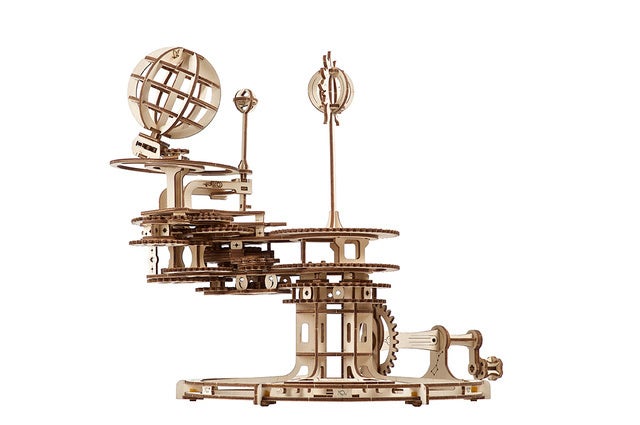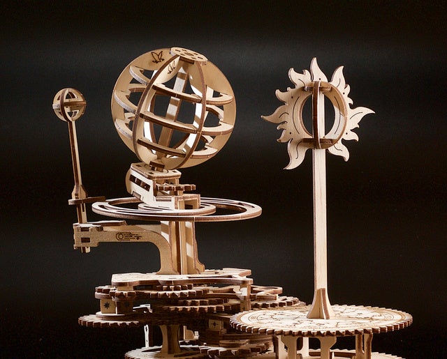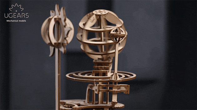 本モデルはいわゆる<三球儀>と呼ばれるもので、太陽・地球・月、これらの宇宙のダンスを描写するユニークなメカニズムをしています。この3Dパズルの動きによって昼夜の原因、月の位相、季節の変化が見え、それらを理解するのに役立ちます。