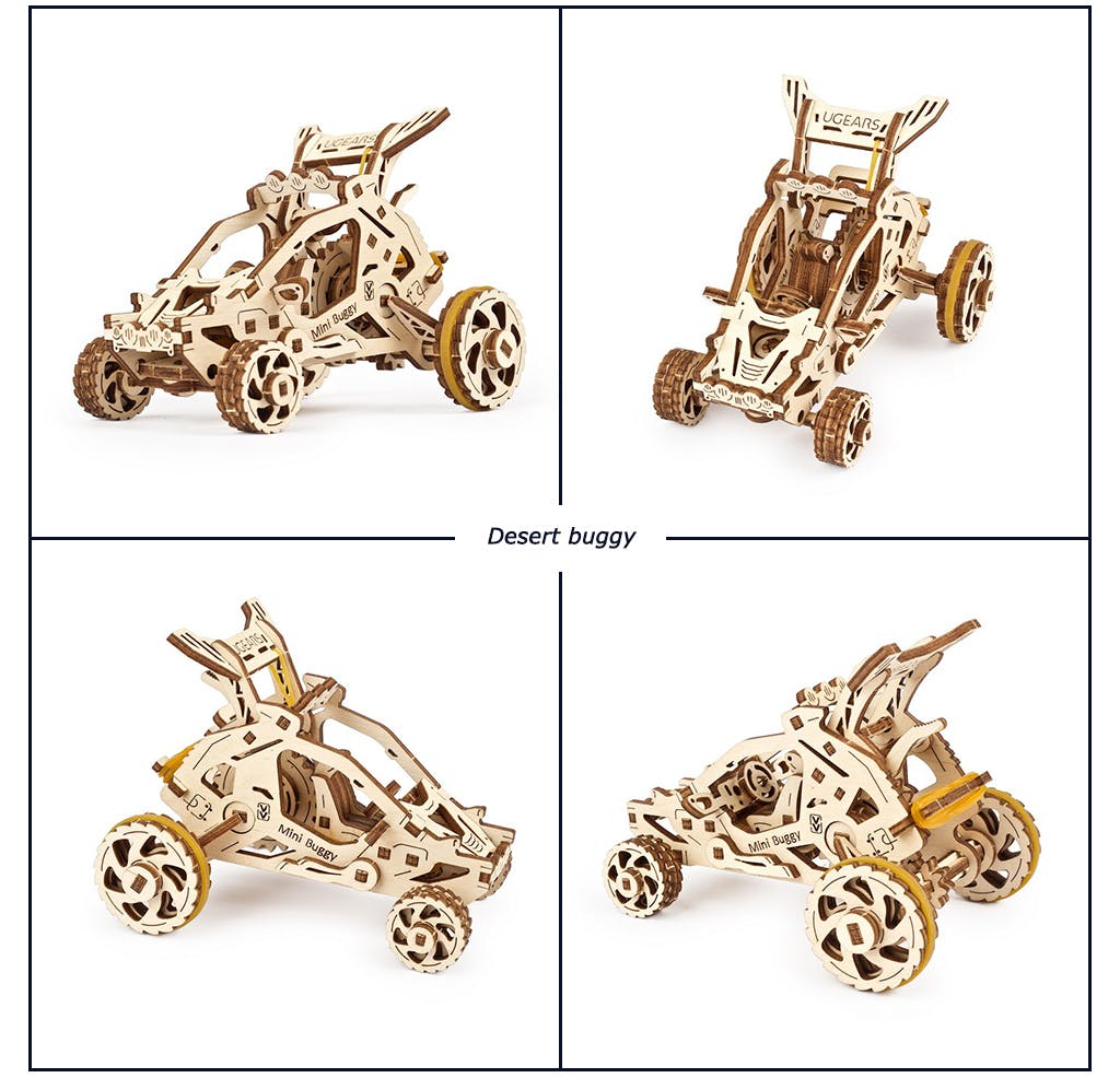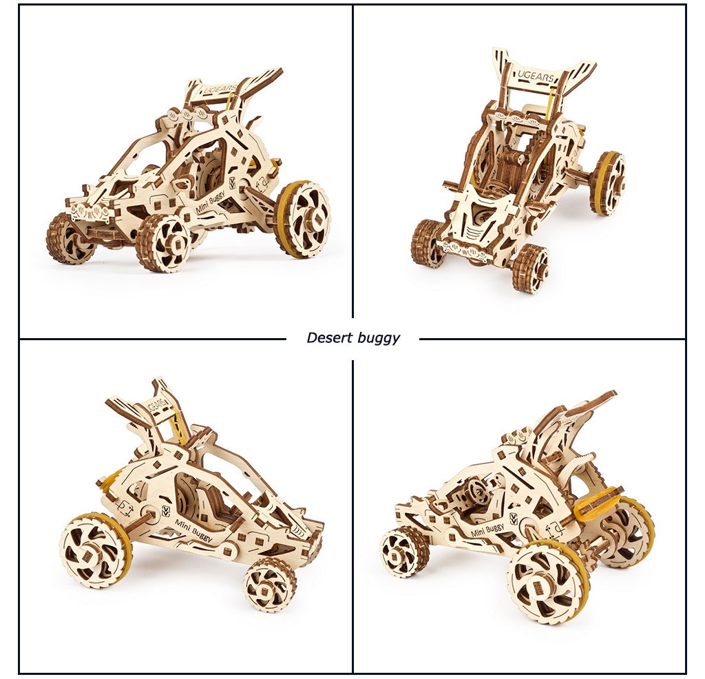 「デザートミニバギー」は自走式の木製3Dパズルです。ラバーモーターを動力に自走します。モーターを巻き上げ、モデルの背面にあるスイッチを反転させると、ラバーバンドの張力を解放して歯車が連動し、モデル自走!
