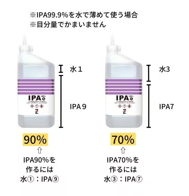 A:IPA(アイソプロパノール)70%~90%です。イソプロパノール、イソプロピルアルコールも同じものです。初めての方は90%でお使いになると使いやすいです。