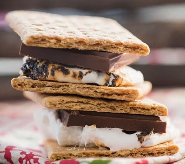 焼きマシュマロをチョコレート・ナッツと一緒にビスケットにはさめば、